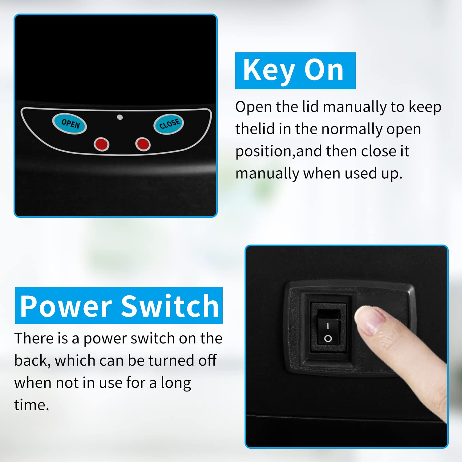 100% TOUCHLESS TRASH CAN: -- Our trash cans use advanced auto-sensing technology. Place your hand about 6 inches above the infrared panel and the lid will open automatically. Press the manual button OPEN on the control panel and the lid will stay open, press CLOSE, and then close. This is the hygienic and convenient option