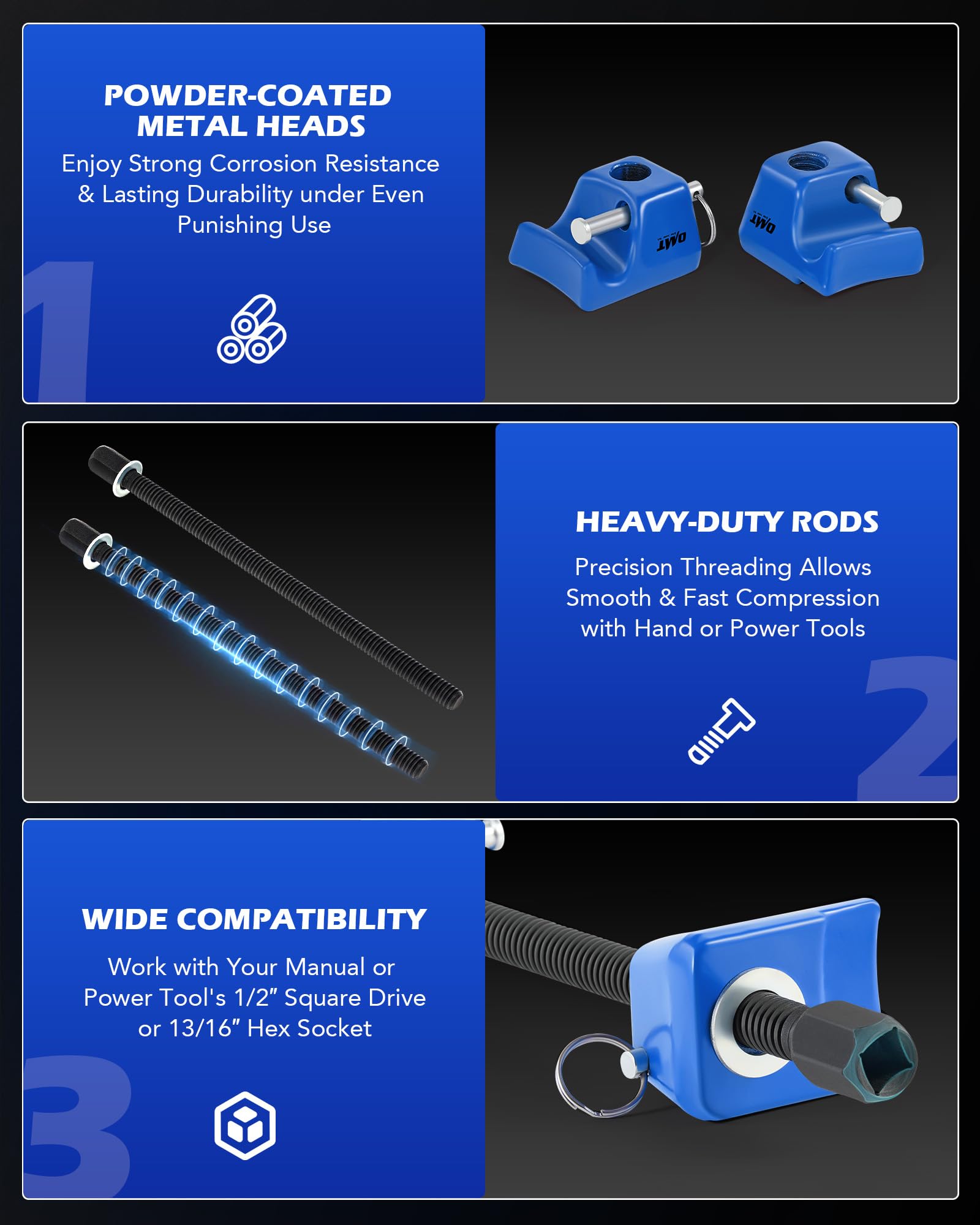 Easy Operation: The main shafts and precision threading on our compressor provide smooth and precise movement. Compatible with your manual or power tool's 1/2" square drive or 13/16" hex sockets, it makes transferring old springs to new struts effortless