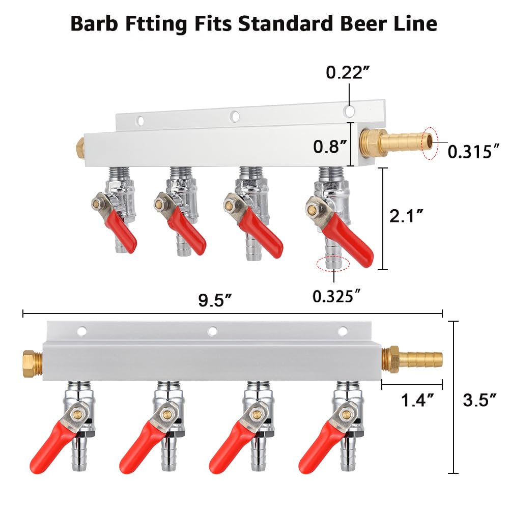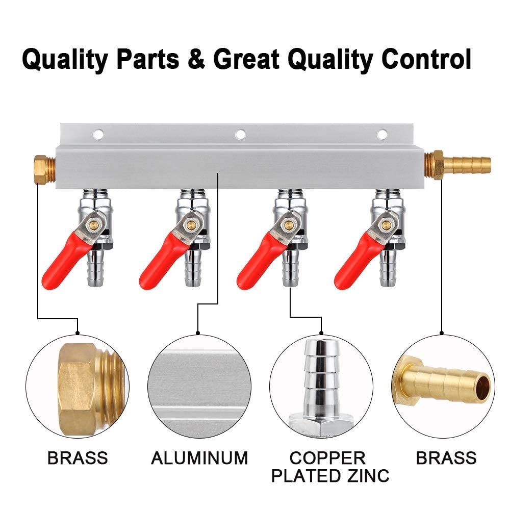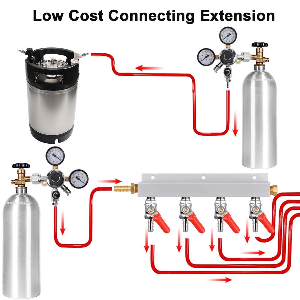 【LOW COST CONNECTING EXTENSION】The gas manifold is designed with four 5/16’’ barb fitting outputs, which allows splitting co2 gas line from 1 output to 4 outputs to brewing keg, no need of high cost multi-connection regulator!