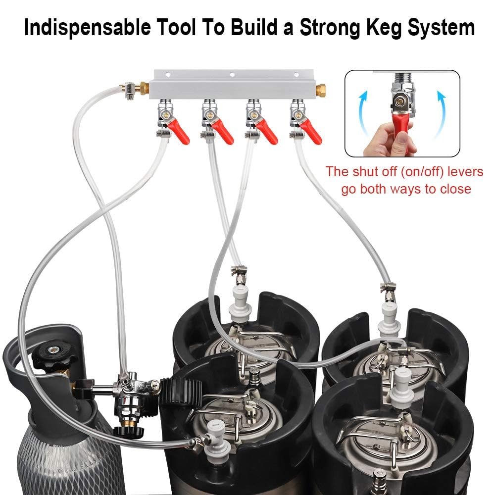 【INDISPENSABLE TOOL TO BUILD A STRONG KEG SYSTEM】This air distributor can let you carbonate four kegs at the exact same pressure setting with a regulator. But it can not carbonate different beers simultaneously that require different carbonation pressures setting!