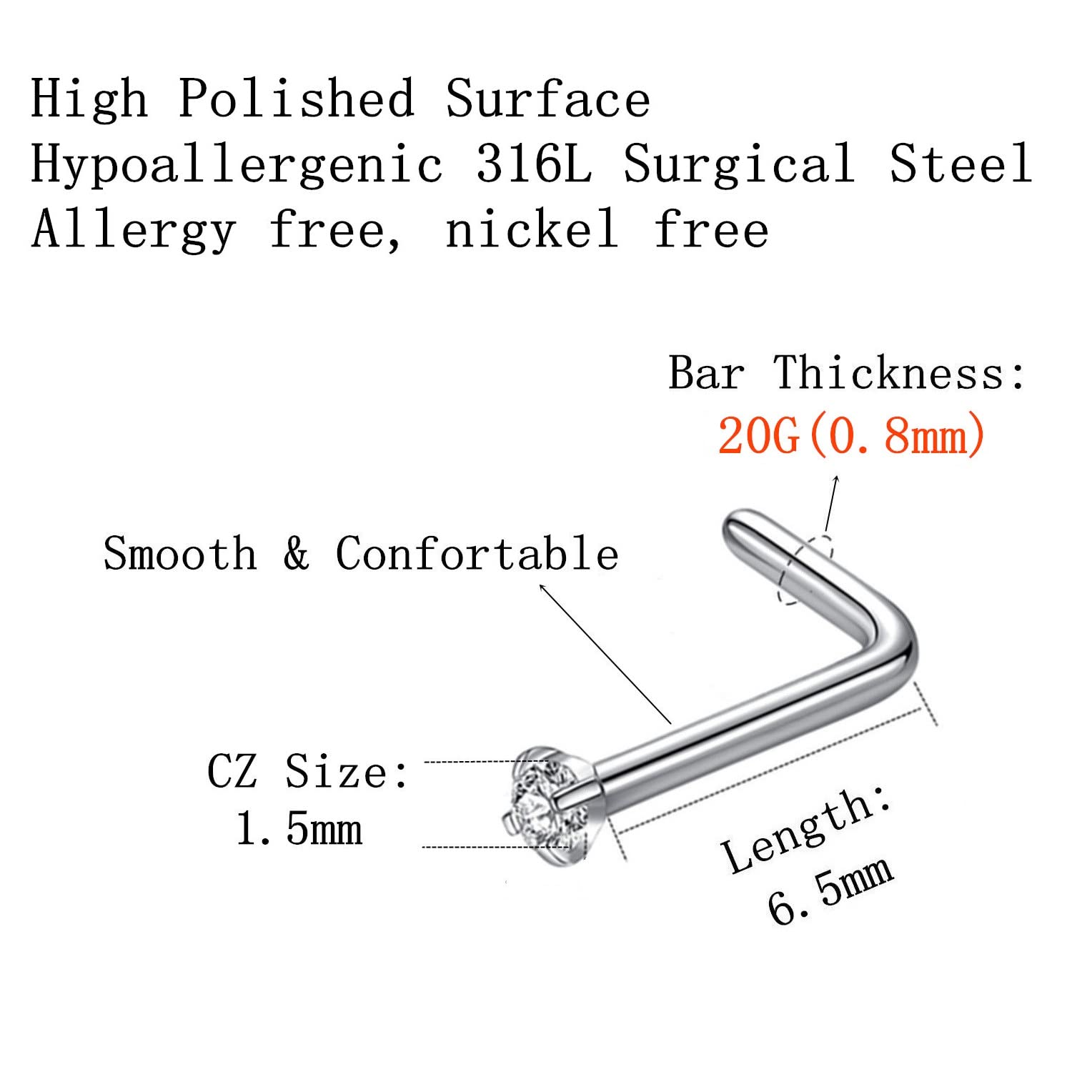 Quantity: 6pcs 1.5mm CZ nose stud. This L shaped nose studs for women size: Bar thickness: 20 gauge (0.8mm), Pin Length:6.5mm, Prong set cubic zirconia: 1.5mm, These stones a very bright and prong set by hand for accuracy.