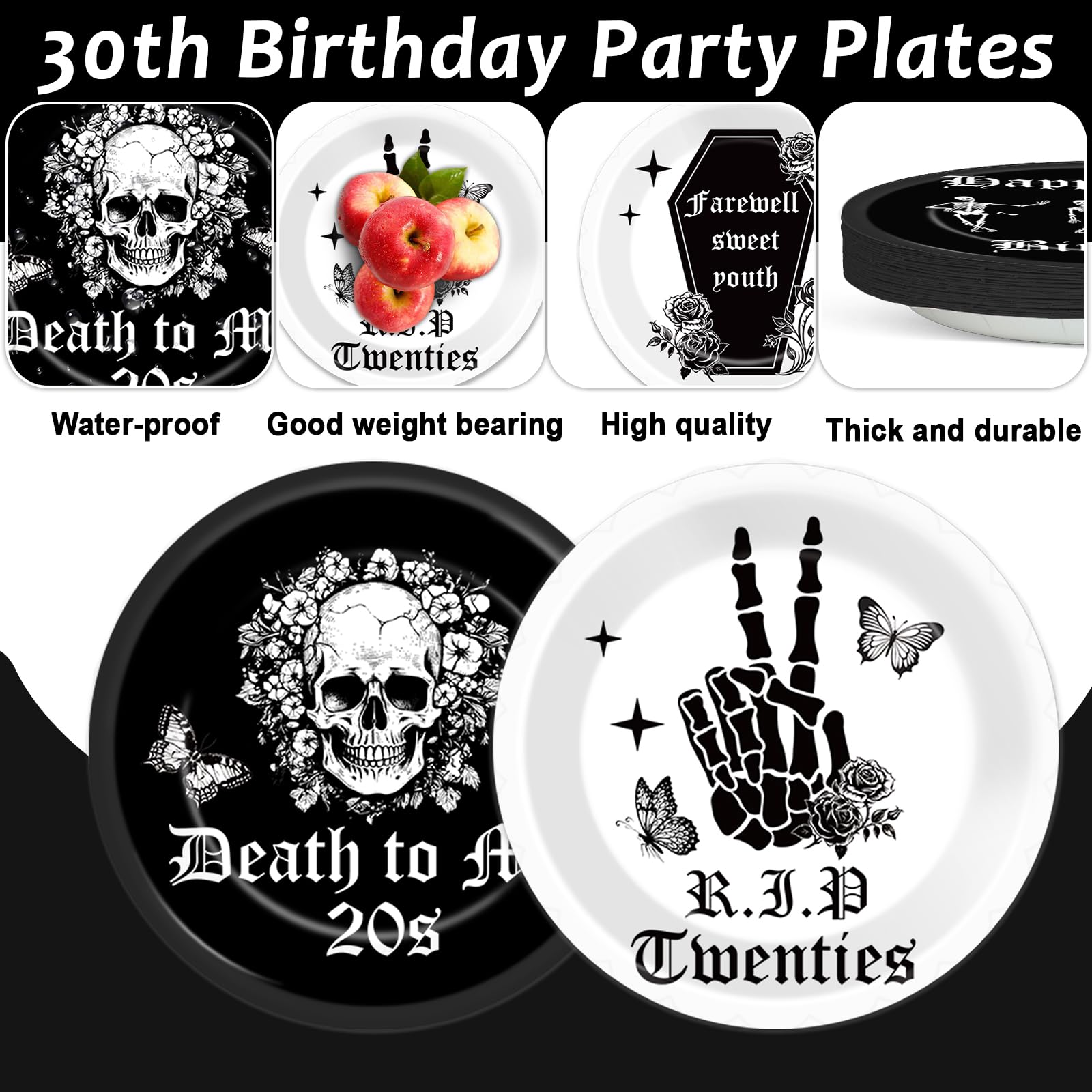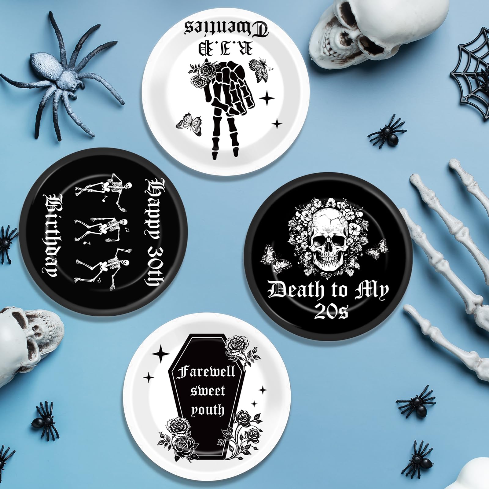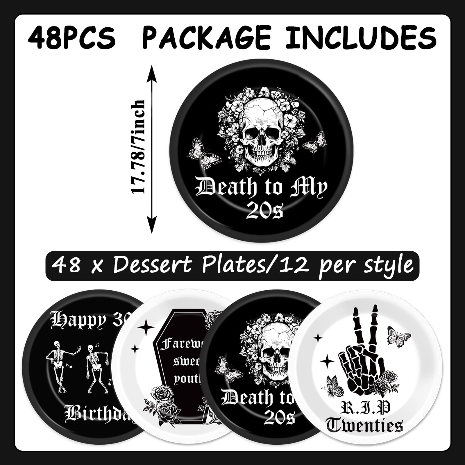 Package contents: A total of 48pcs for this gothic death to my 20s party plates set, including death to my 20s paper plates in 4 different styles and 12pcs for each, ensures that you have enough 30th birthday party supplies to create a great cheerful party atmosphere that will leave a lasting impression.