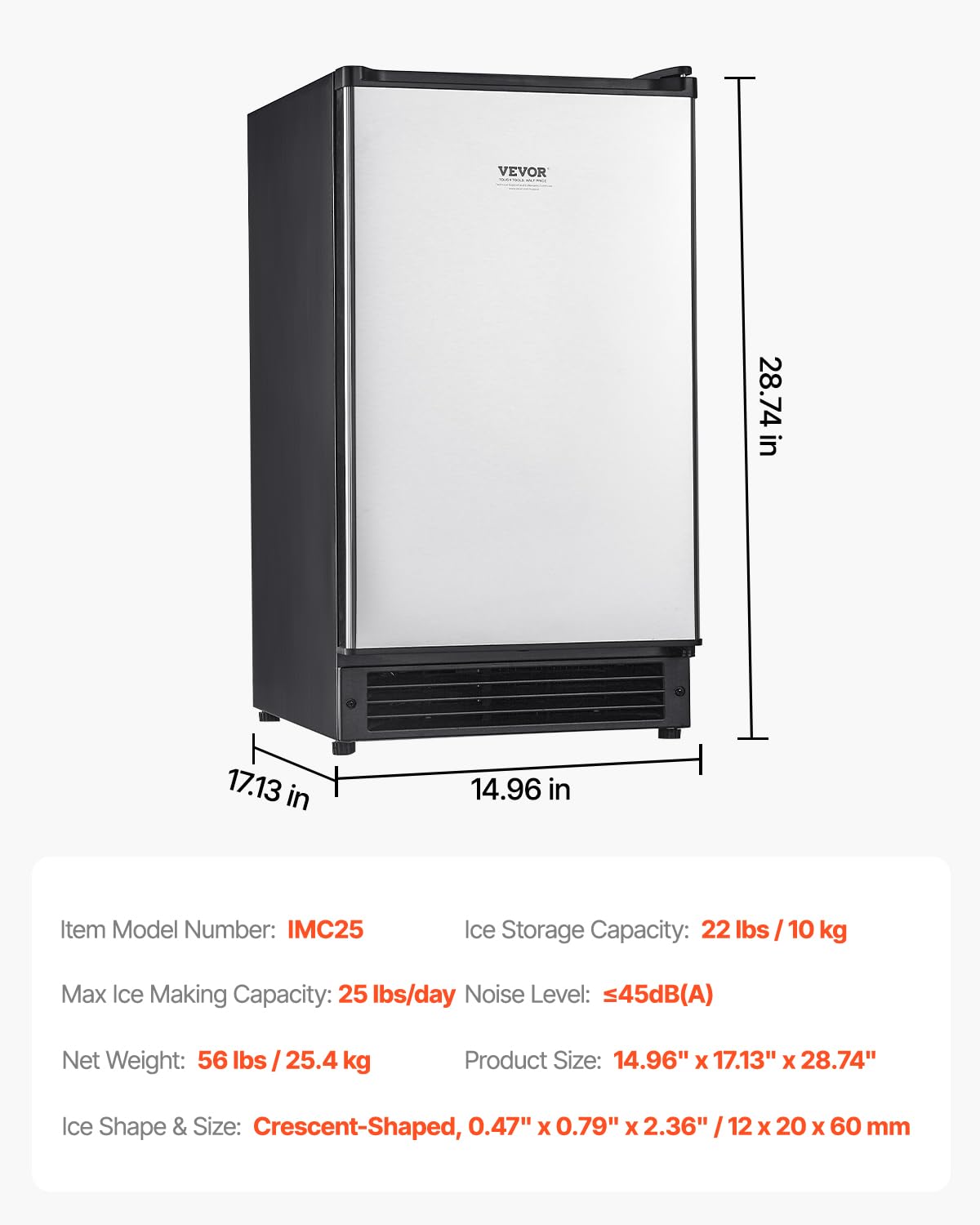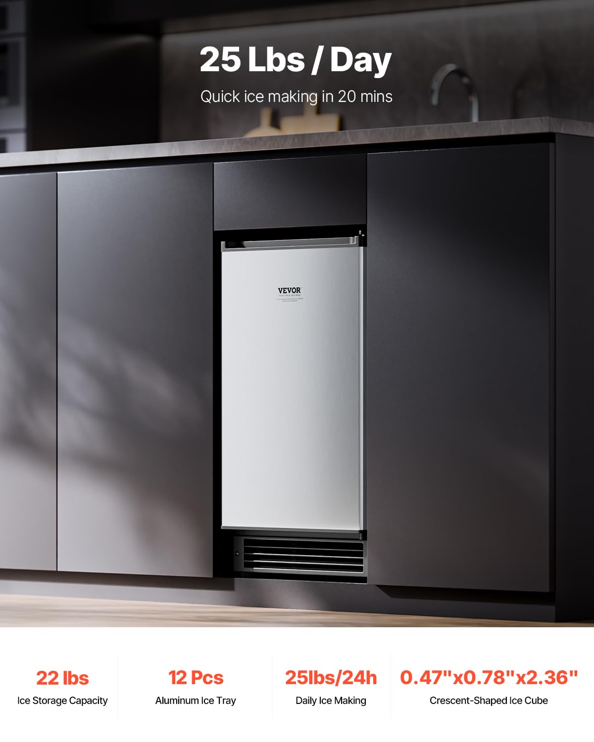 Fast Ice Making & Large Ice Storage: Our undercounter built-in ice maker can produce up to 25 lbs of ice within 24 hours and store up to 22 lbs. It features an 12-cube aluminum ice tray, making crescent-shaped ice cubes (0.47x0.79x2.36 inch) in as fast as 20 minutes. Ideal for home use or parties.
