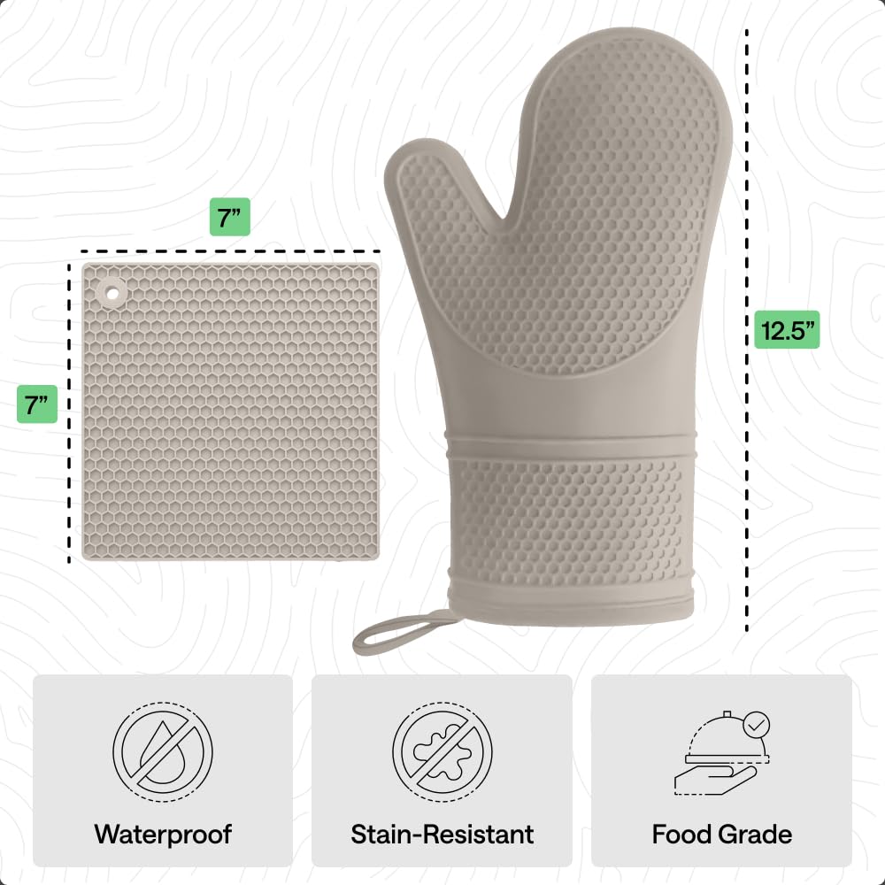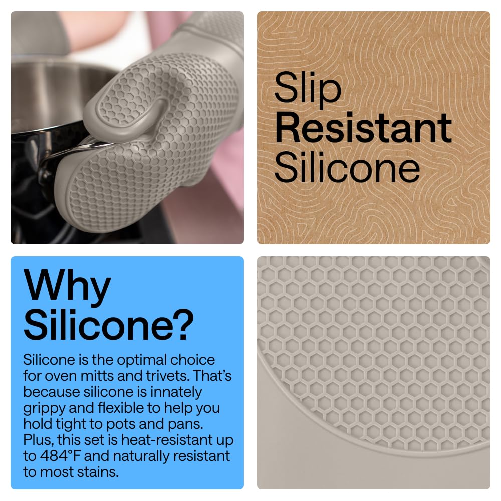 GET A BETTER GRIP: constructed of durable silicone, oven mitt and trivet set is naturally slip resistant, helping you to get the best grip while you cook; unique textured honeycomb pattern helps you hold tight to pans, pots and baking sheets without hindering your natural grip; trivets stay firmly in place on countertops as well