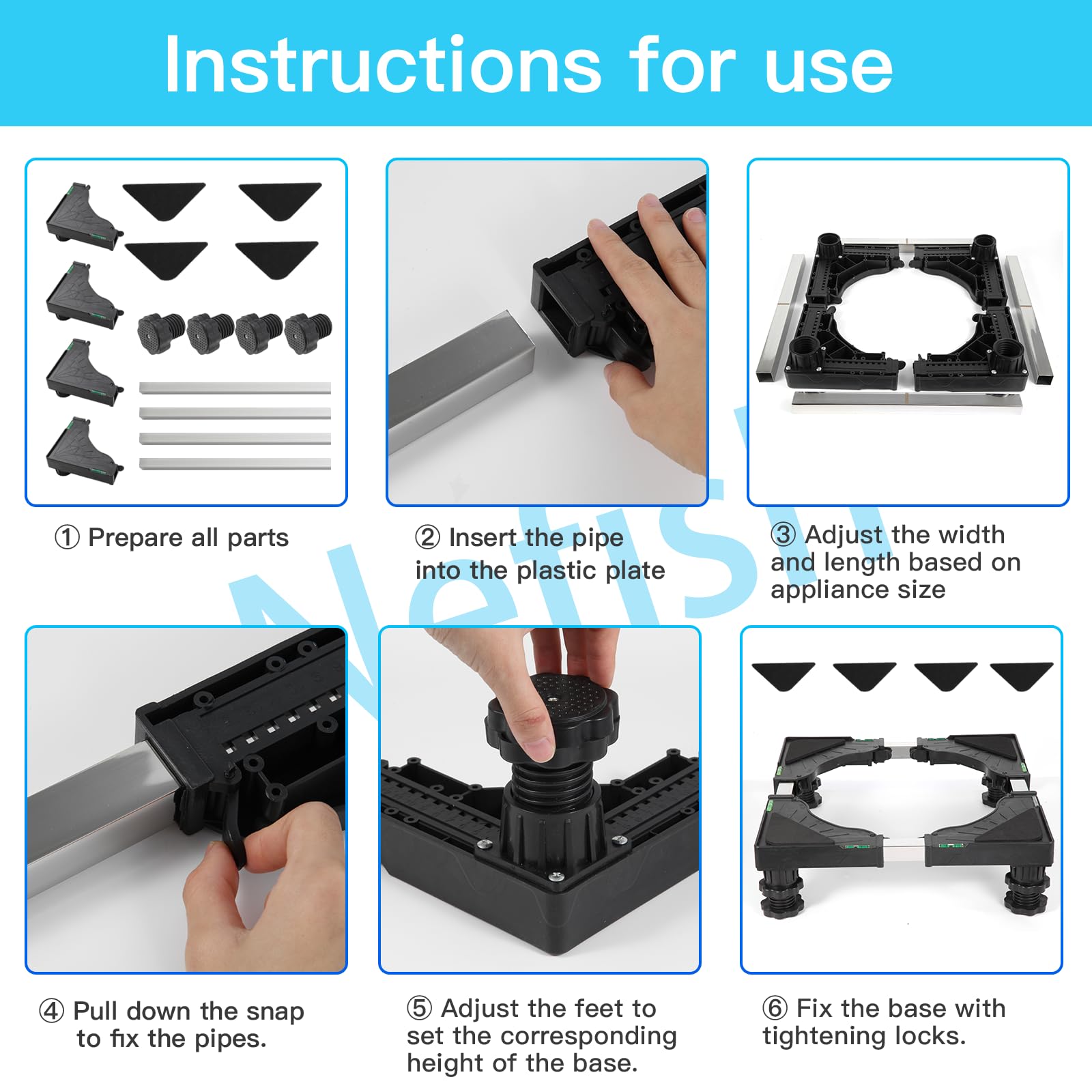 DOUBLE SIZE ADJUSTMENT: With adjustable steel poles and feet, Nefish black appliance base stand can be adjusted from 16 inches to 24-3/8 inches (width and length), from 4 inches to 5.1 inches (heights) fit different appliances and furniture