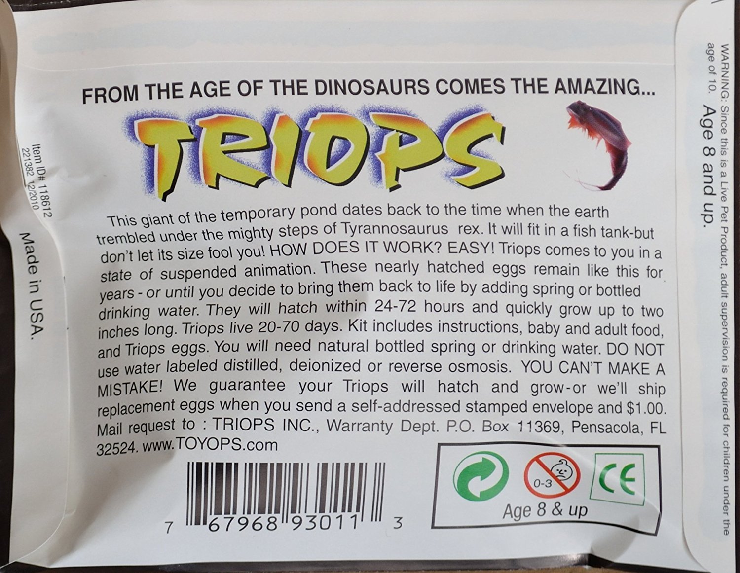 Learn about the prehistoric sea creatures from the dinosaur era. Complete with an acrylic tank. Just add triops eggs (eubranchiopoda) to the tank and within 3 days you will observe small primitive organisms dating back 200 million years. Triops can grow over 1 inch in 30 days. Food and instructions are included.