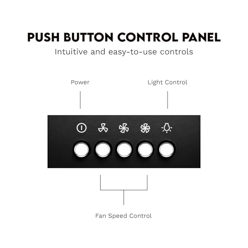 PUSH BUTTON CONTROLS: Range hood equipped with push button control panel to manage multiple functions, including fan speed, lights and power