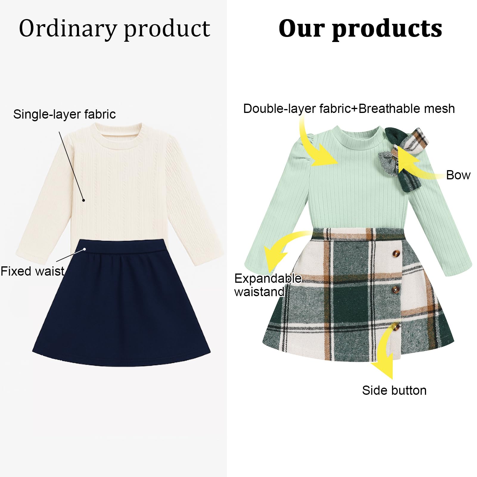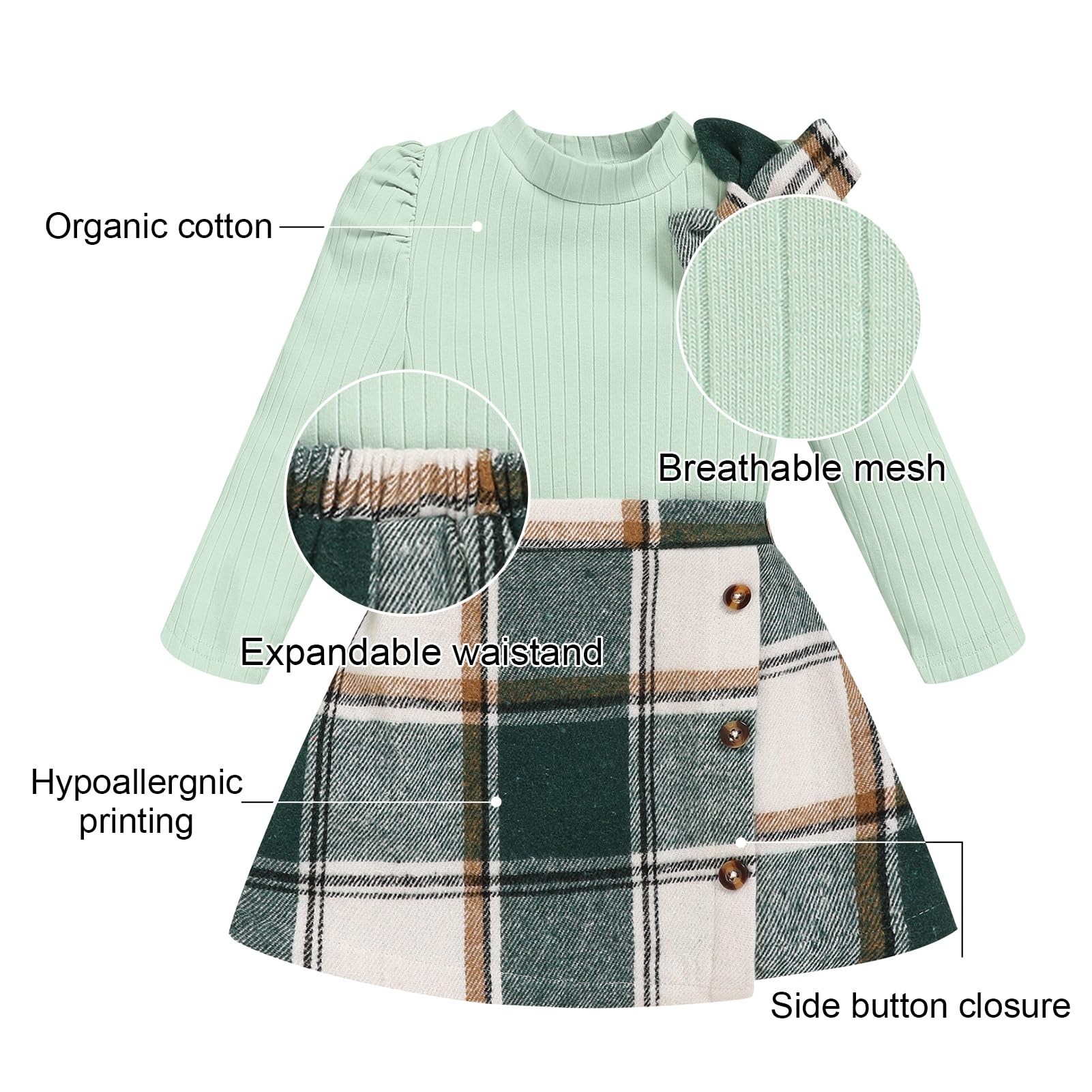 MATERIAL: Toddler girl shirt sweater top is made of cotton and polyester, bottom skirt is made of cotton blend and polyester, soft, breathble, and comfortable, sweet toddler baby girl 2 piece skirt set, cute baby girl clothes.
