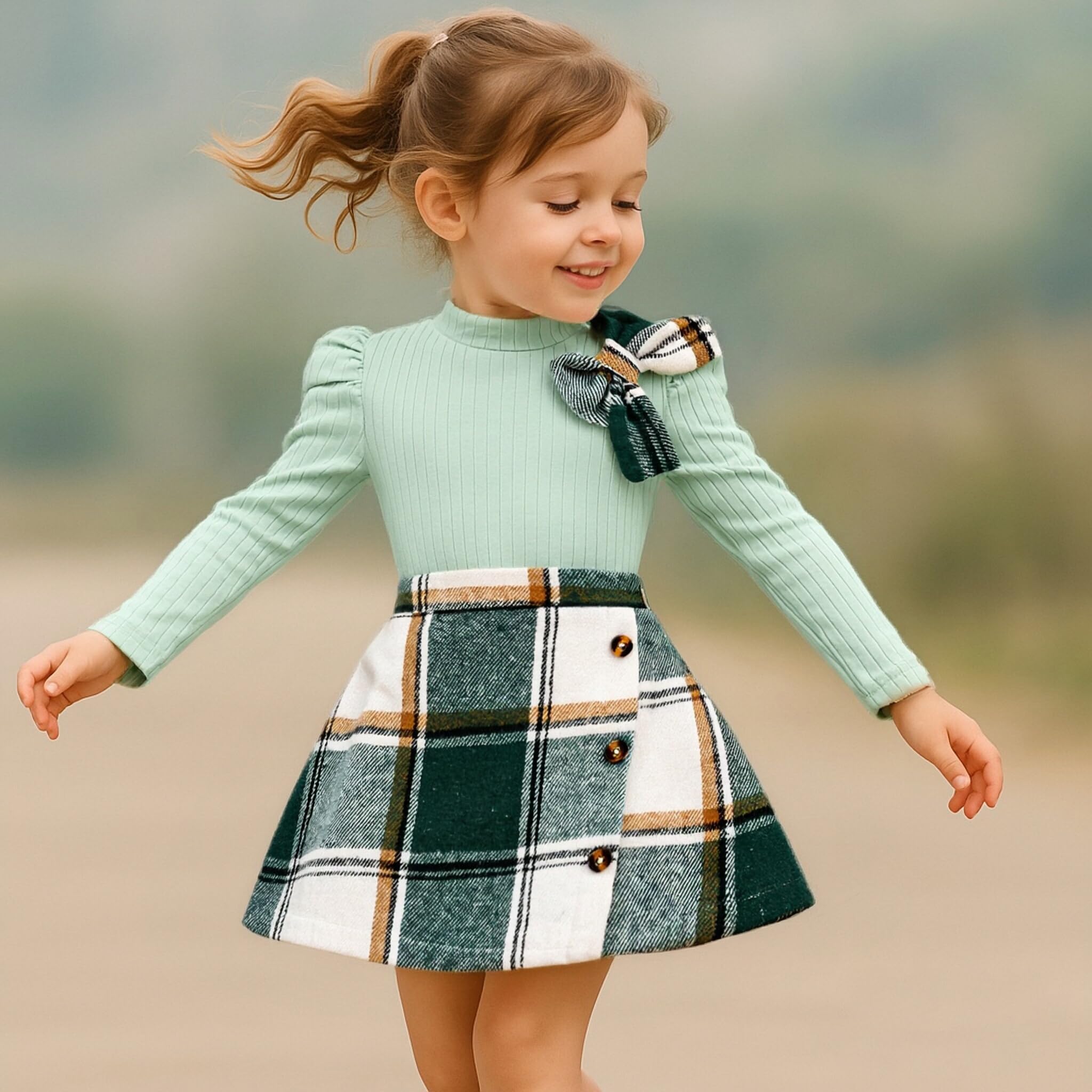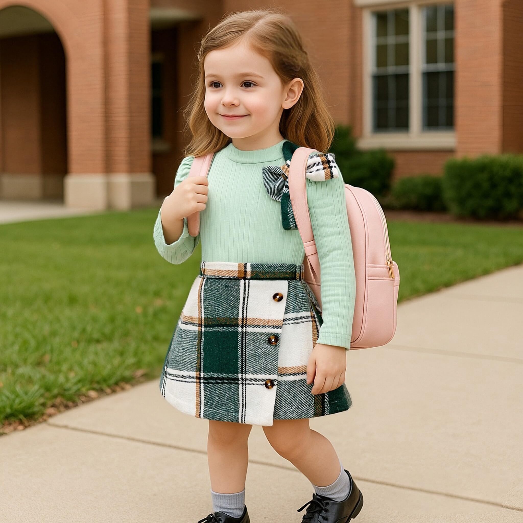 Design: Kids Little girl spring fall winter skirt set,knitted cotton long sleeve solid color top, button mini skirt with elastic waist , winter fashion warm toddler girls clothes outfits.