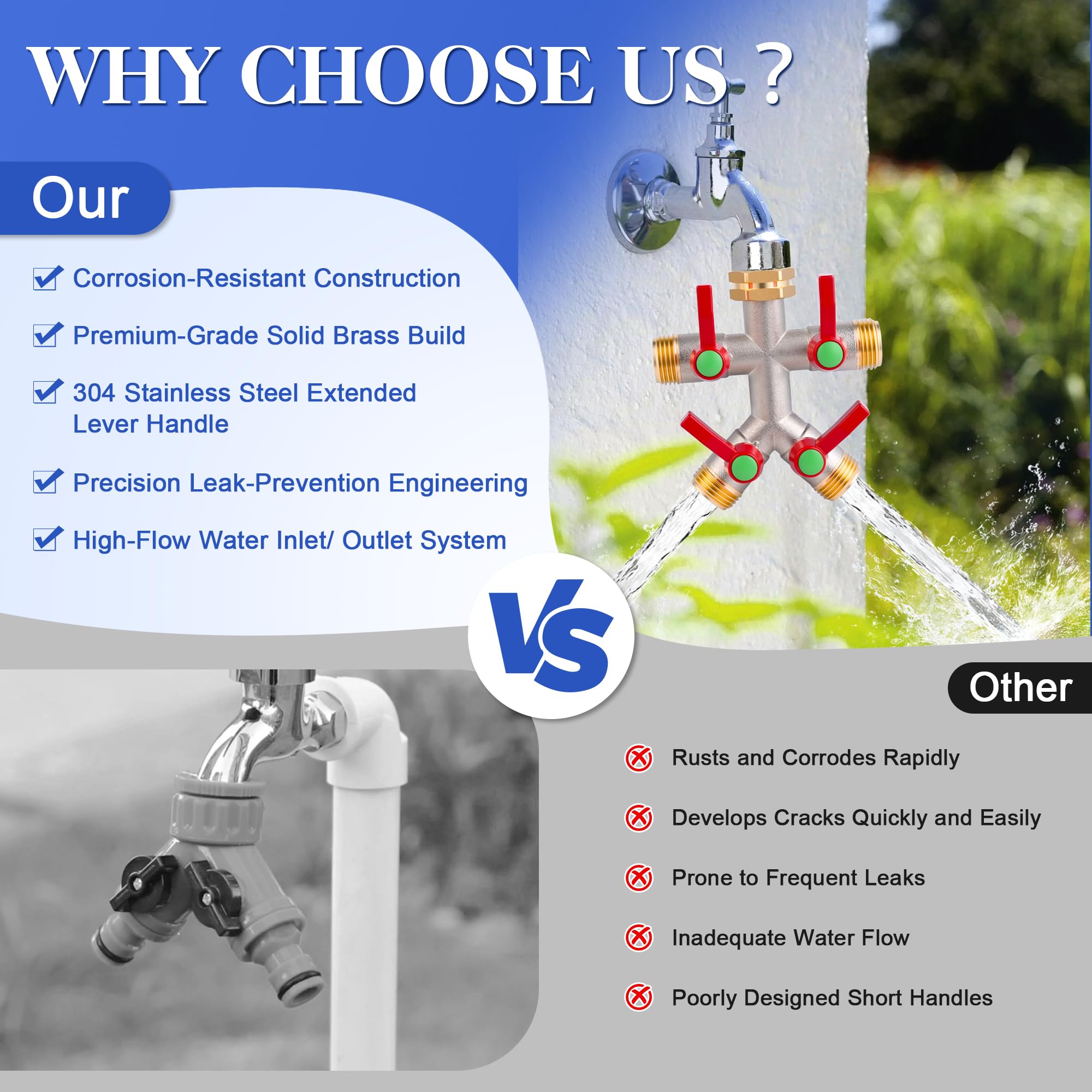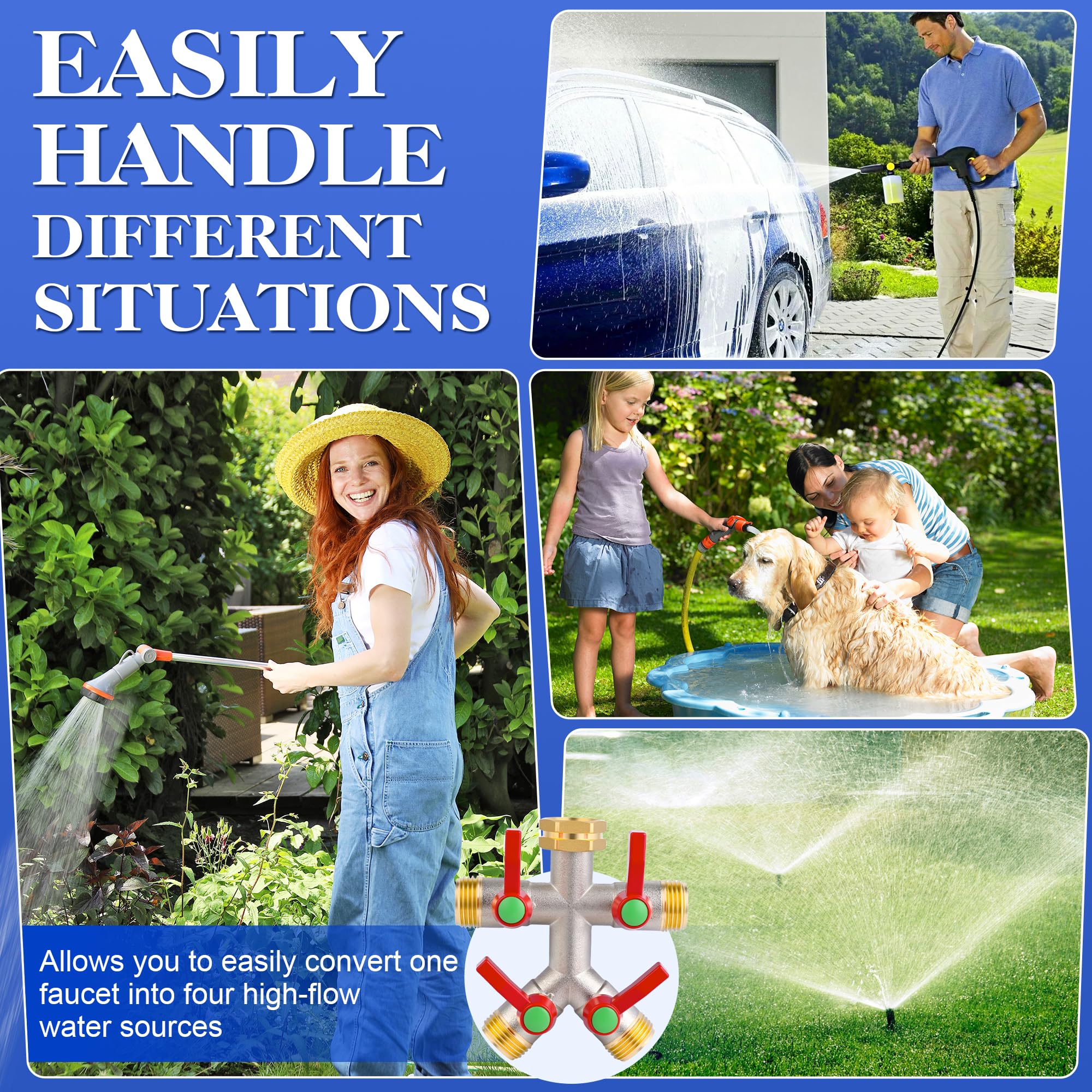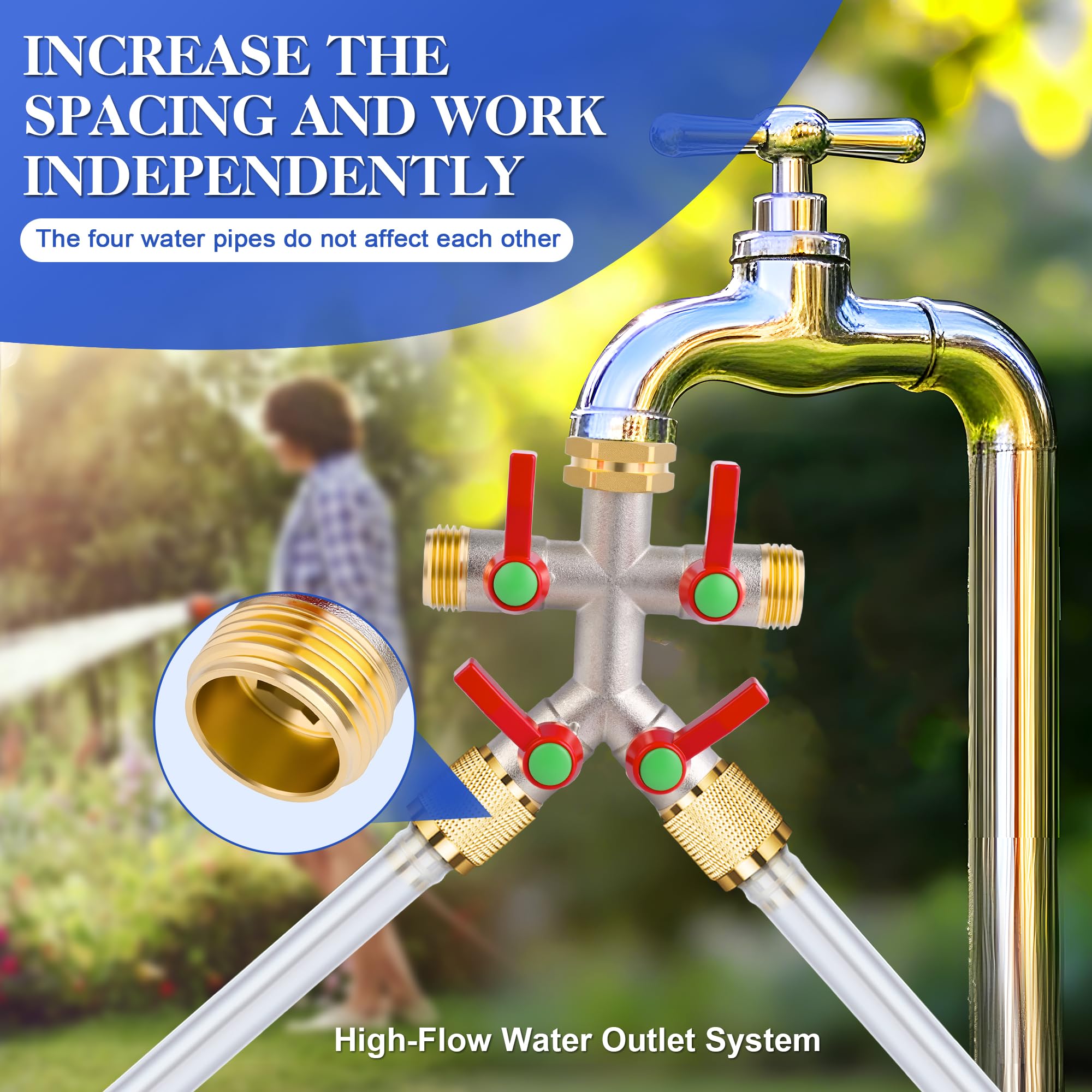 [25% more water output] The diameter of the outlet of 4 way hose splitter is increased, and the water flow rate is increased.Each outlet of the splitter corresponds to an independent valve controller,4-way water pipe diverters can be turned on or off at any time; 4 way heavy-duty splitter can be discharged at the same time to realize multi-way water supply.