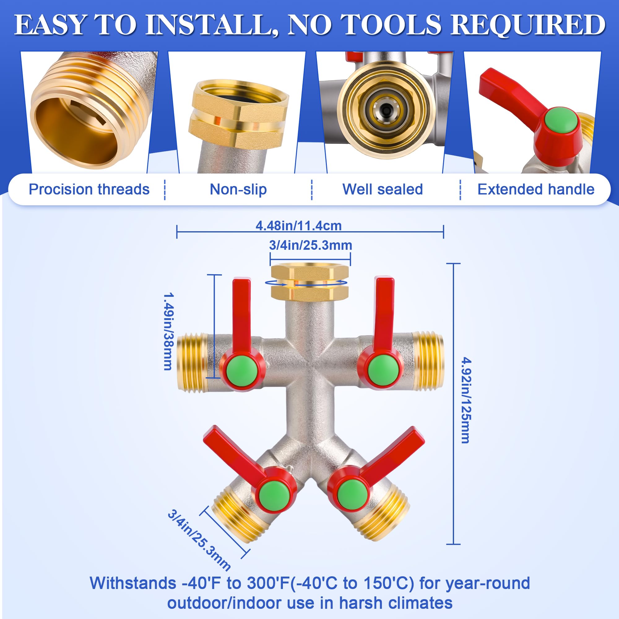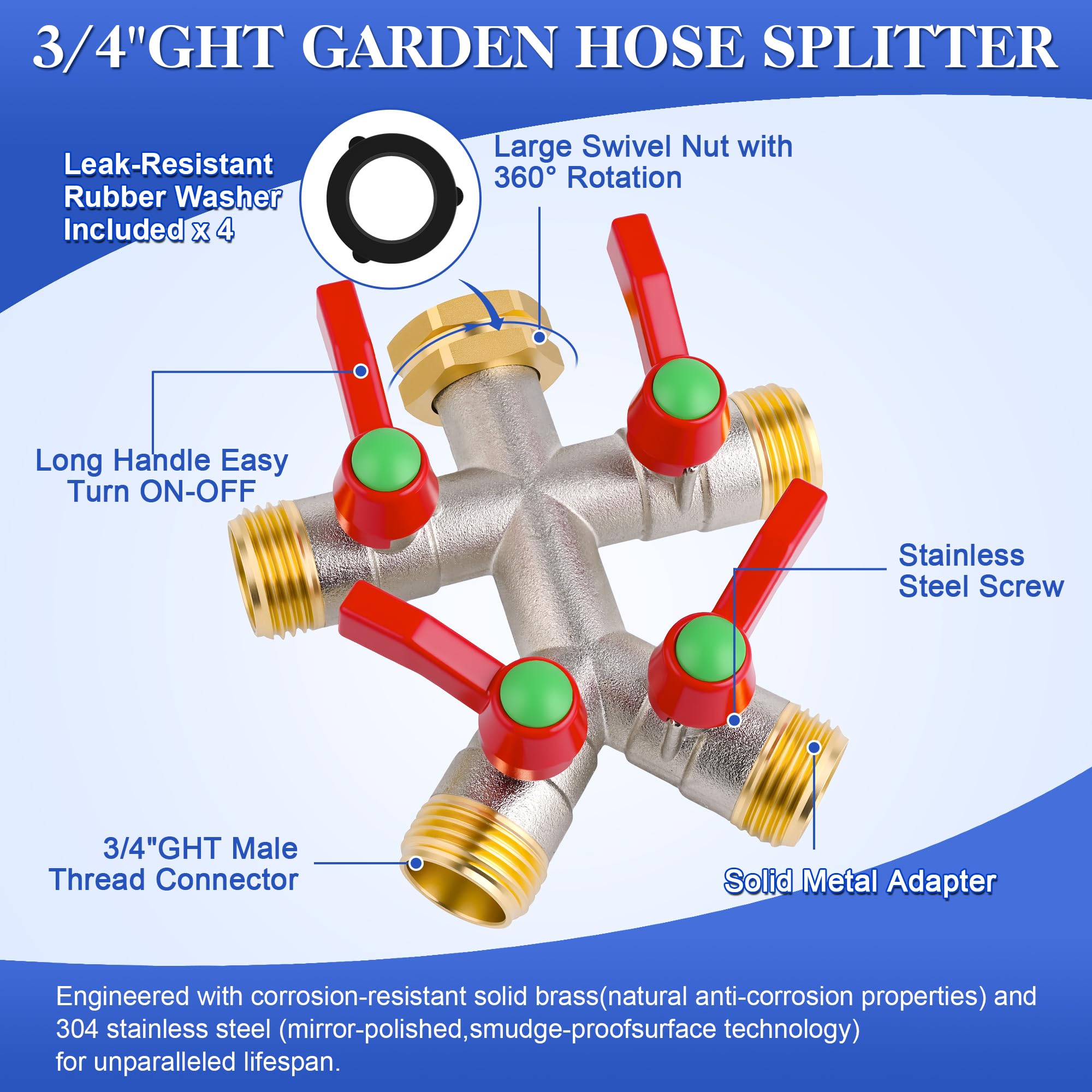 [Standard Connection]The inlet of 4 way splitterr is GHT 3/4-inch female thread, and the outlet of 4-way splitter is GHT 3/4-inch male thread, which is compatible with any North American standard 3/4-inch faucet, hemispherical on/off valve, which can effectively prevent water leakage.