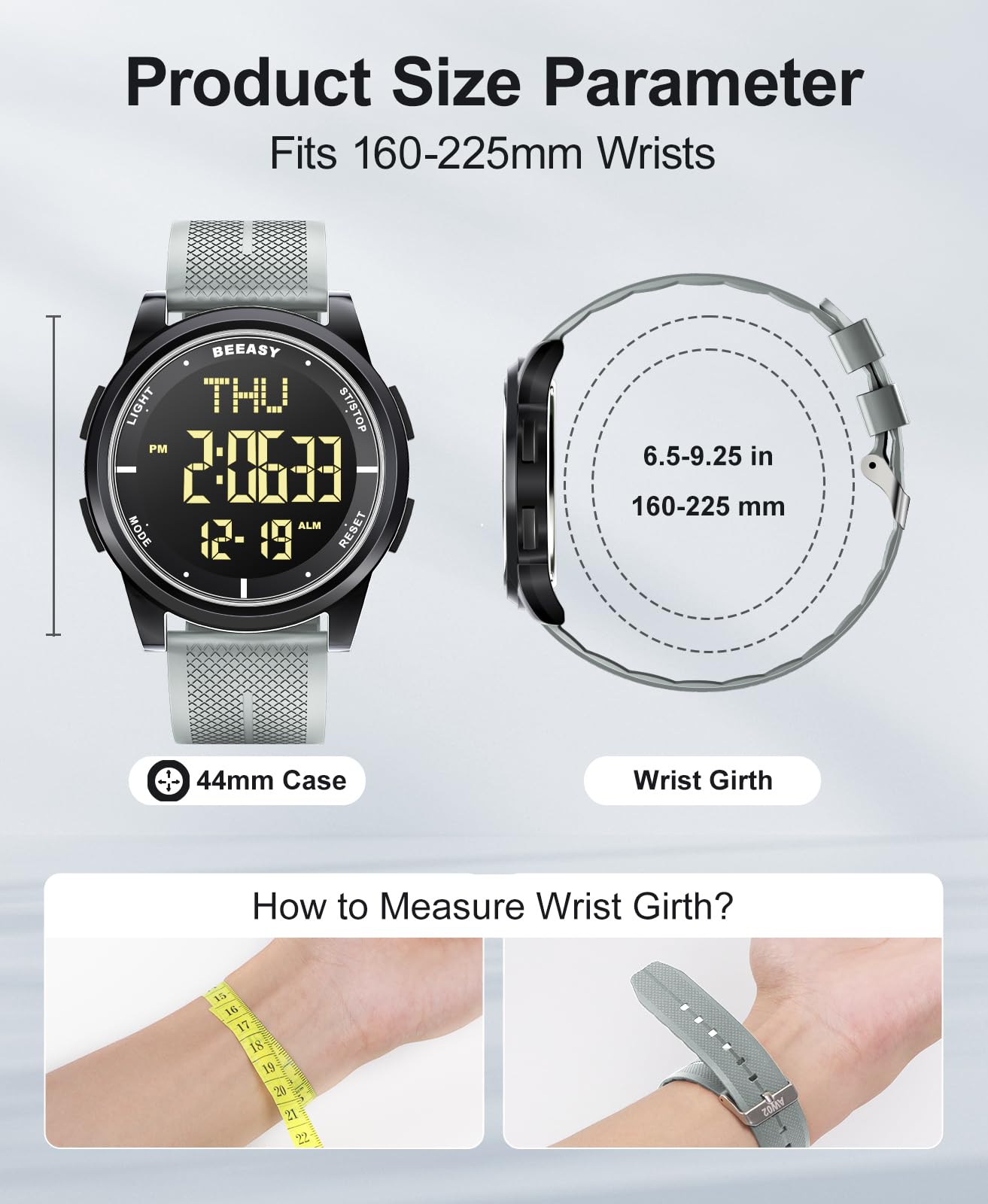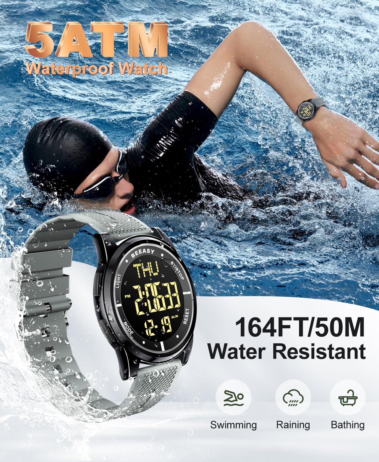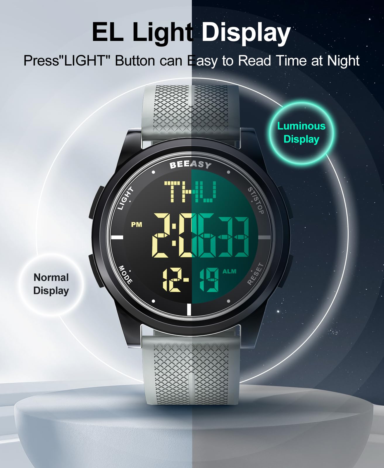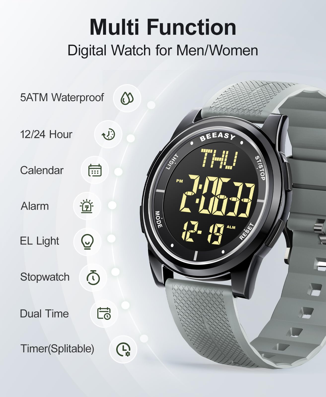 Description Ultra-Thin Digital Watch – Sleek, Waterproof & Multi-Functional Versatile & Stylish Design Designed for both men and women, this ultra-thin (6.6mm) digital watch combines modern minimalism with high functionality. Its sleek case and textured band offer a lightweight, comfortable fit for all-day wear. Crystal-Clear EL Backlight Display Features a wide-angle digital screen with bright EL backlight, ensuring effortless readability day or night. Perfect for low-light conditions, workouts, or travel. 50m Water Resistance – Swim & Shower Safe Built for active lifestyles, this watch is waterproof up to 164ft (50m), making it ideal for swimming, showering, and rainy weather. Smart Multi-Function Features 12/24-hour time format Date & day display Alarm, stopwatch, and countdown timer Dual time zone support (great for travelers) Durable & Comfortable for Everyday Wear The scratch-resistant screen and flexible textured band ensure long-lasting durability, while the ultra-lightweight build keeps it comfortable for work, sports, or travel. Perfect for Active Lifestyles Whether you're swimming, running, traveling, or working, this digital watch keeps you on time with reliable performance and sleek style.