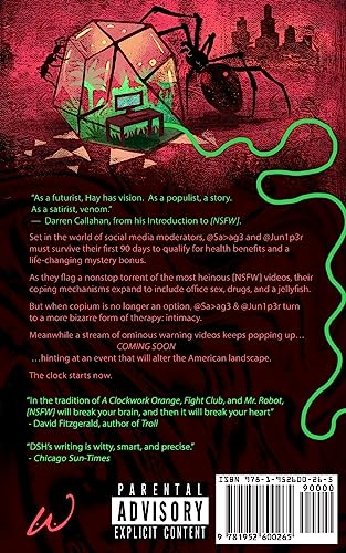 An experimental horror-lit set in the near future about connection and isolation. The Office meets A Clockwork Orange. Set in the world of social media moderators, @Sa>ag3 and @Jun1p3r must survive their first 90 days to qualify for benefits and a life-changing mystery bonus. As they flag a nonstop torrent of the most heinous [NSFW] videos, their coping mechanisms expand to include on-the-job sex, drugs, and a jellyfish. But when copium is no longer an option, @Sa>ag3 & @Jun1p3r turn to a more bizarre form of therapy: intimacy. Meanwhile a stream of ominous warning videos keeps popping up... COMING SOON... hinting at an event that will alter the American landscape. @Sa>ag3 & @Jun1p3r are on the digital front line with their finger on the DELETE button. Will love survive in this new age?