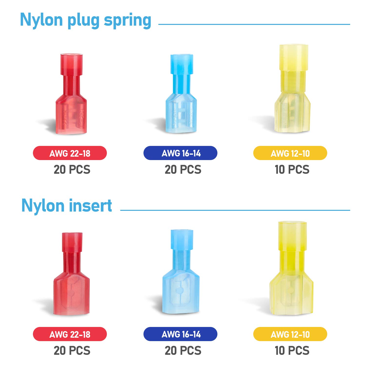[COLOR and SIZE]: The connector assortment includes red (AWG 22, AWG 21, AWG 20, AWG 19, AWG 18, AWG 17, AWG 16), blue (AWG 16, AWG 15, AWG 14) and yellow (AWG 12, AWG 11 , AWG 10) nylon spade connectors that can be used on wire AWG from 22 to 10. Red, blue and yellow indicate different gauge size of electrical connectors for easy identification when using