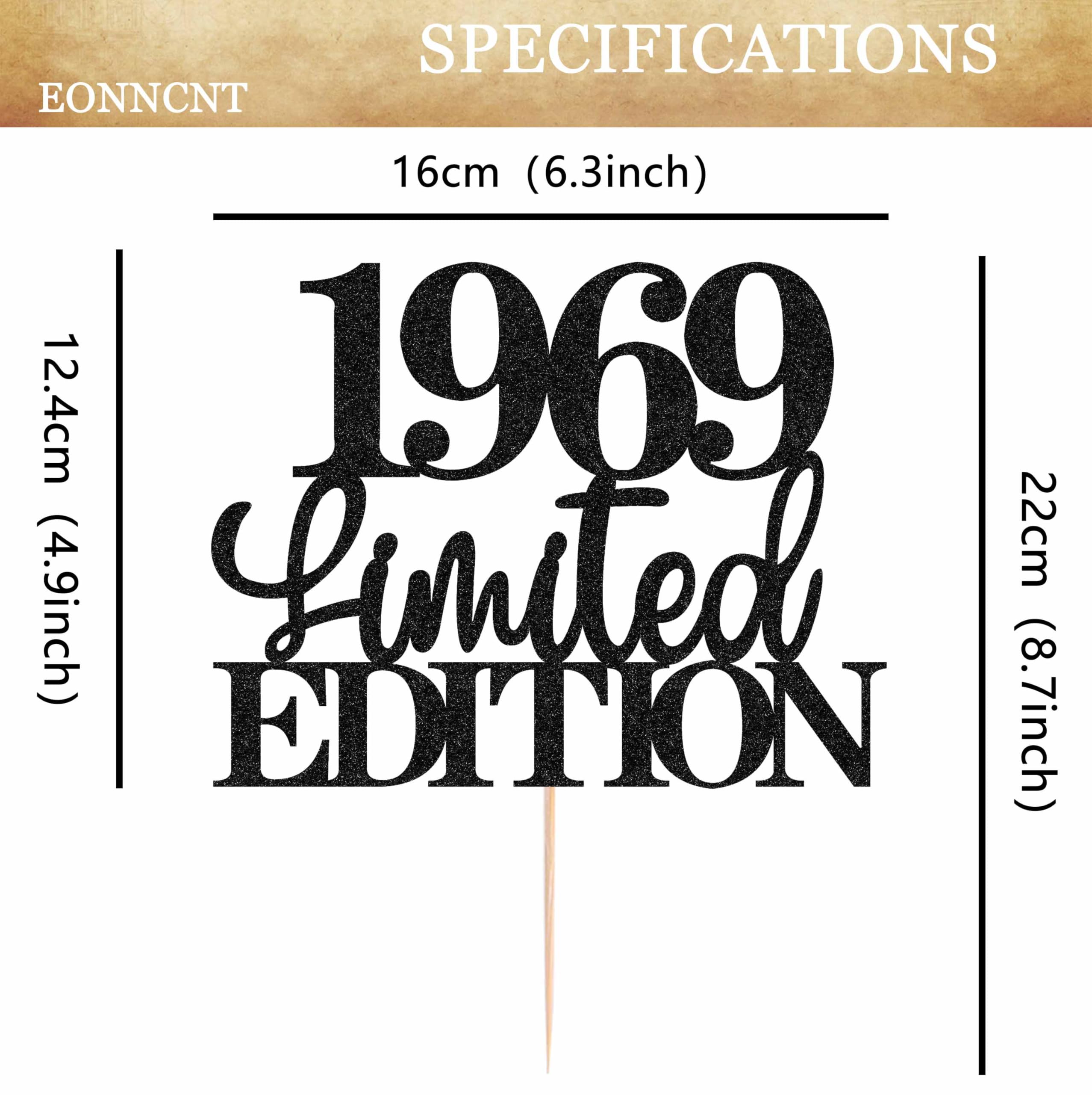 🌹Have you been looking for a decoration that can make your birthday cake instantly dazzling? Do you yearn to find the finishing touch that perfectly embodies the glorious 57 years of history?🌹 [Brand Introduction] 💞EONNENT is a team dedicated to the research and development of party products. Our team hopes that our product can bring you happiness. Let you receive everyone's blessings at your important milestone moment, leaving no regrets💞 [Product Include] 🎈1PCS Limited EDITION 1969 Cake Topper [Core Features and Functions of The Product] ✨Shining Light Function ✨Theme highlighting function [Product Material and Quality] We have chosen high-quality friendly materials to create the Limited EDITION 1969 Cake Topper. This material is lightweight yet very sturdy, not easily deformed or damaged, and can be stably placed on top of cakes. After meticulous processing, the surface is smooth and delicate, ensuring that glitter elements can firmly adhere and will not easily fall off. Under strict quality control, every cake topper meets high standards, so you don't have to worry about any quality issues during the party. It will consistently add luster to your birthday cake and accompany you throughout the unforgettable 57th birthday celebration [Product Design and Appearance] In terms of design, the Limited EDITION 1969 Cake Topper cleverly blends classic and fashionable elements. It is presented in a simple and atmospheric style, with the black "1969" number complementing the sparkling effect, showcasing the solemnity and preciousness of the 57th birthday while retaining the vitality and charm of modern fashion. Its exquisite design and just the right size make it perfect for pairing with multi-layer luxury cakes or simple single-layer cakes, becoming the most attractive decoration on cakes. Its color matching has been carefully blended to harmoniously blend with various birthday party themes, it can naturally blend in and enhance the aesthetic taste of the entire party scene [Product Tips] ‼️ The product is not edible, do not put it in your mouth ‼️ The product is made of cardboard and cannot be cleaned 💞Let's enjoy this beautiful day together without any regrets💞