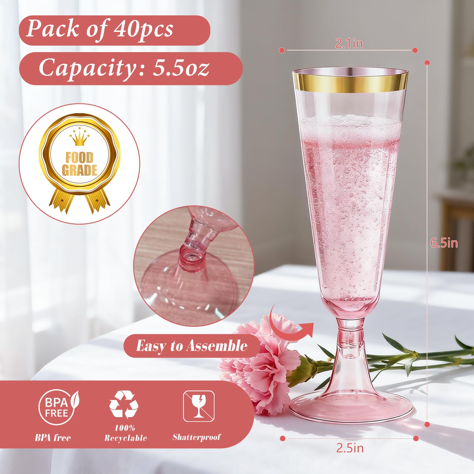 【Convenient and Disposable】 This 40 pack plastic champagne flutes for parties is designed for convenience and ease of use. Crafted from high-quality, food-grade plastic material that’s BPA-free, this plastic wine flutes can be easily carried and disposed of after use.And these plastic champagne glasses hold a generous 5.5 ounces, making them perfect for toasts and special moments.