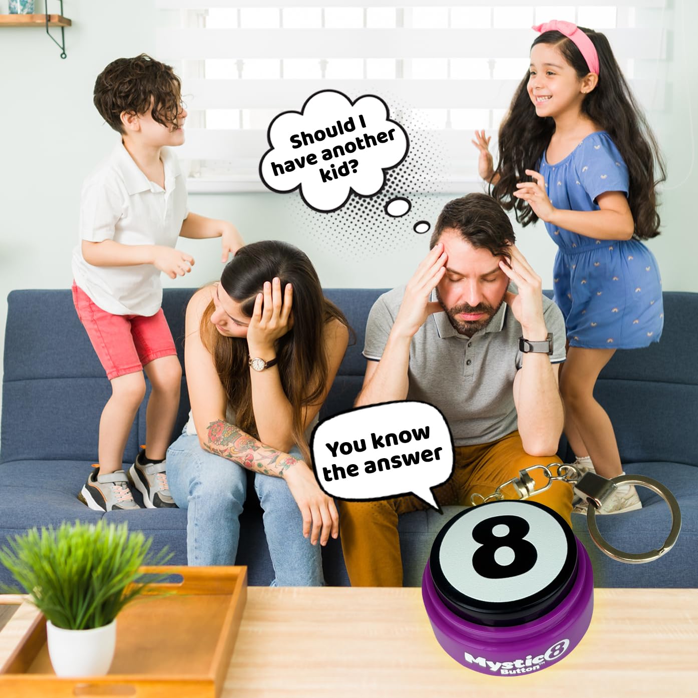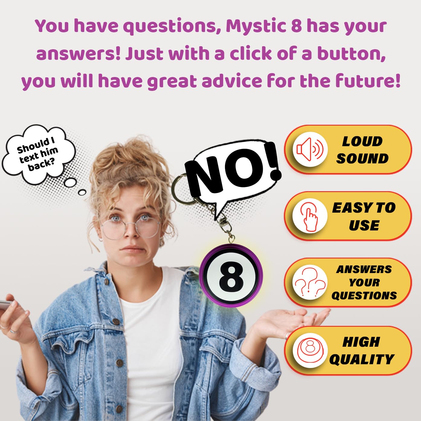 ๐ฎ The Mystic 8 keychain button is a modern magic 8 ball that can be taken anywhere! . This fortune teller can answer any of your questions you may have. It is like a mini magic 8 ball that is with you at all times when you most need a question answered. ๐ง๐ปโโ๏ธ It has 15 audios, which makes this novelty toy a great funny gag gift! The audios are the following: Yes, Definitely no, The answer is yes, No, Everything indicates yes, Definitely yes, Most likely a no, Everything indicates no, I have no idea, I donโt know the answer, Looks like a yes, Doesnโt look clear yet, Ask me later, Looks like a no, You know the answer. ๐ฎ This Mystic 8 keychain button is also great as a white elephant gift for adults, It's a fun new way to predict the future! If you are a fan of the magic eight ball, you will love this! ๐ง๐ปโโ๏ธ Super easy to use, just press the button and let the Mystic 8 button answer your doubts. You will be shocked what the future holds for you. It's a funny gift for women, men, coworkers, friends. ๐ฎ This product is not a Magic 8 Ball nor is it associated in any way with the Magic 8 Ball. Magic 8 Ball is a registered trademark of Mattel, Inc. Also, disclaimer, no the button can not predict the future, if it did then Biff from Back to the Future would get a hold of it instead of the almanac.