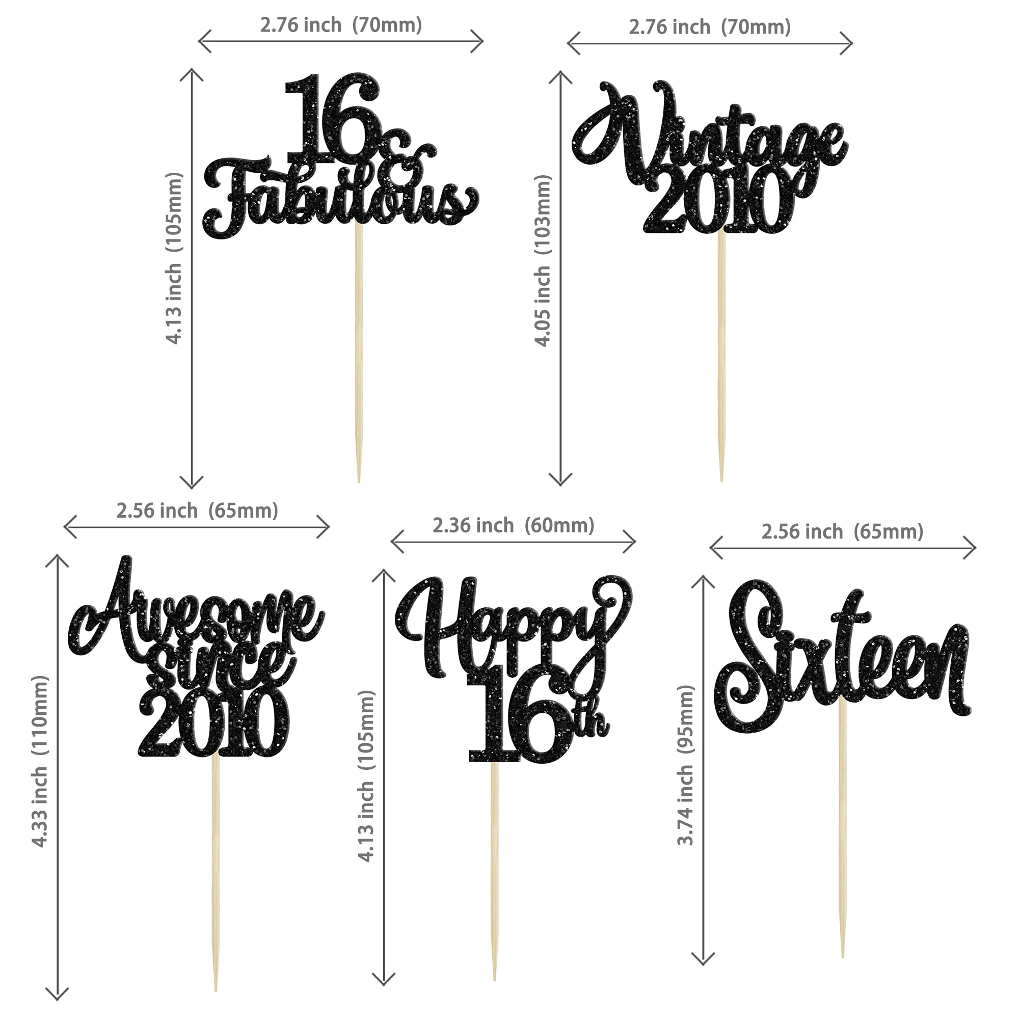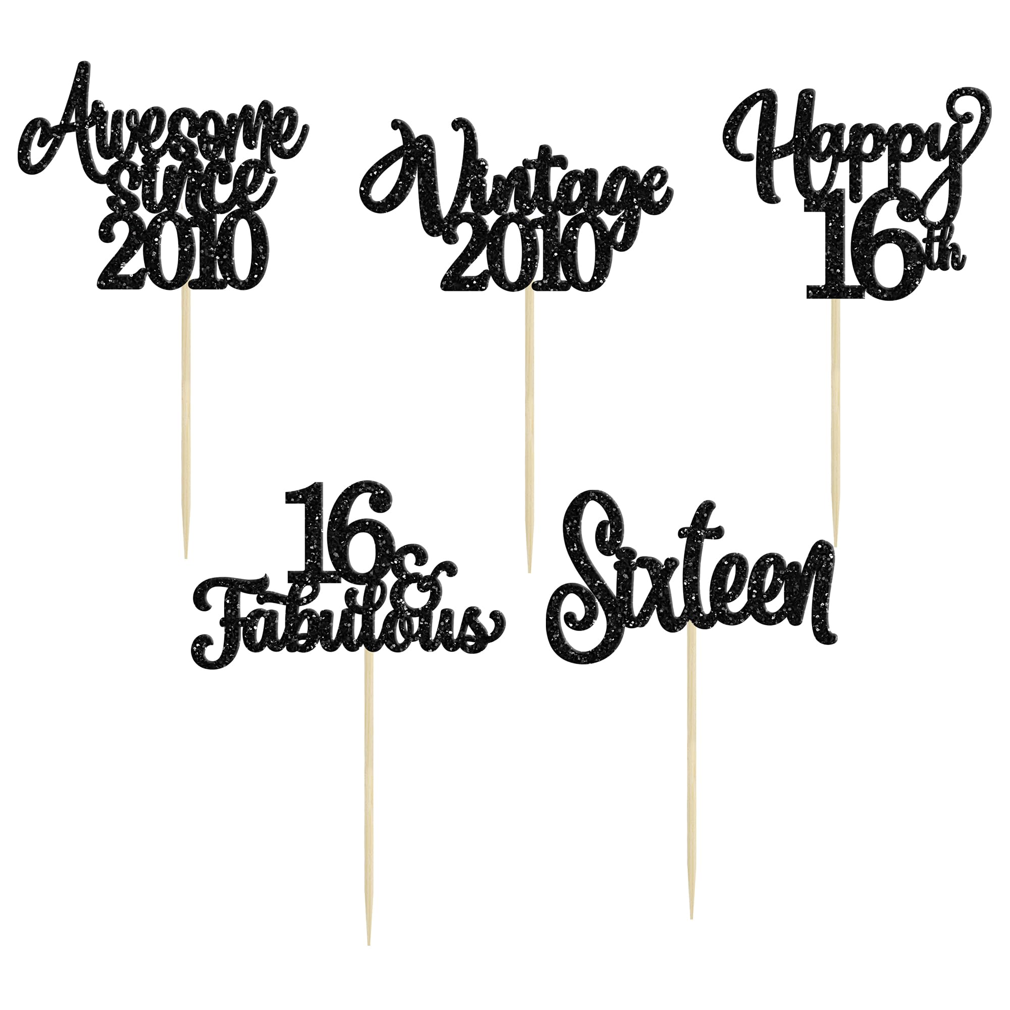 Material and Usage - Usage: They are perfect for vintage 2010 theme party, 16th birthday theme party, 16th wedding anniversary theme party,cheers to 10 years theme party cupcake decorations, which make the cupcake look tastier and more attractive. - Material: Made of paper material, solid, not easy to deform and fade and can reuse for many times; Please don't put them into oven for they are only decorative and not edible. Package and Size - Package: Pack of 30Pcs. Size: W 2.4"*H 3.9"/W 6*H 10cm(Include Stick). Comes with assembled, so you can insert into your cake directly, which make your cake more interesting. - If you want to return the item, please kindly contact us first, then we will deal with it until you are satisfied. Note 1.The cupcake topper picks have pointed end, please keep away from children when using. 2. These cupcake toppers are for decoration purposes only, not edible and do not place in oven or use for baking. 3. Due to the light and screen difference, the item's color may be slightly different from the pictures.