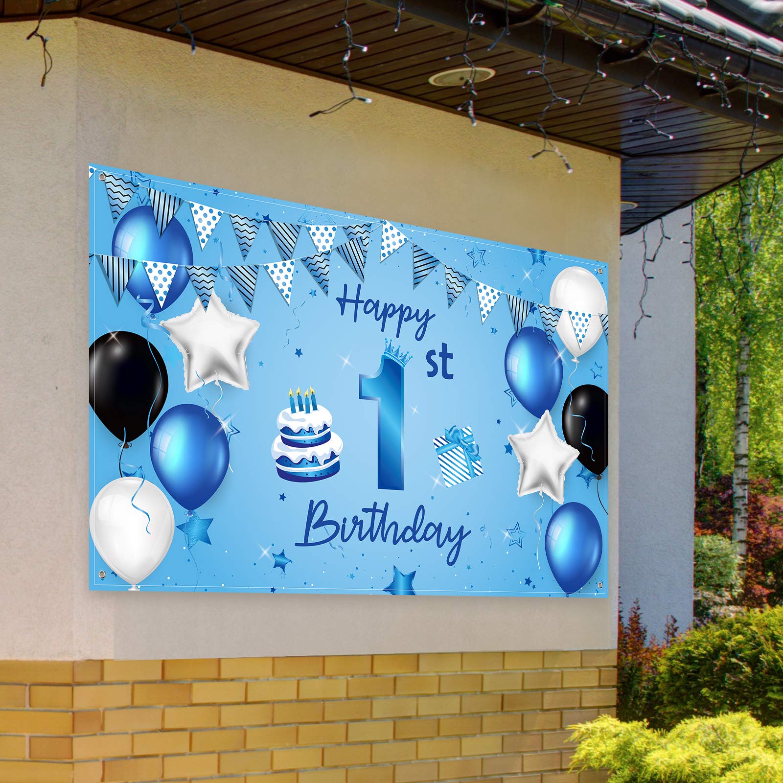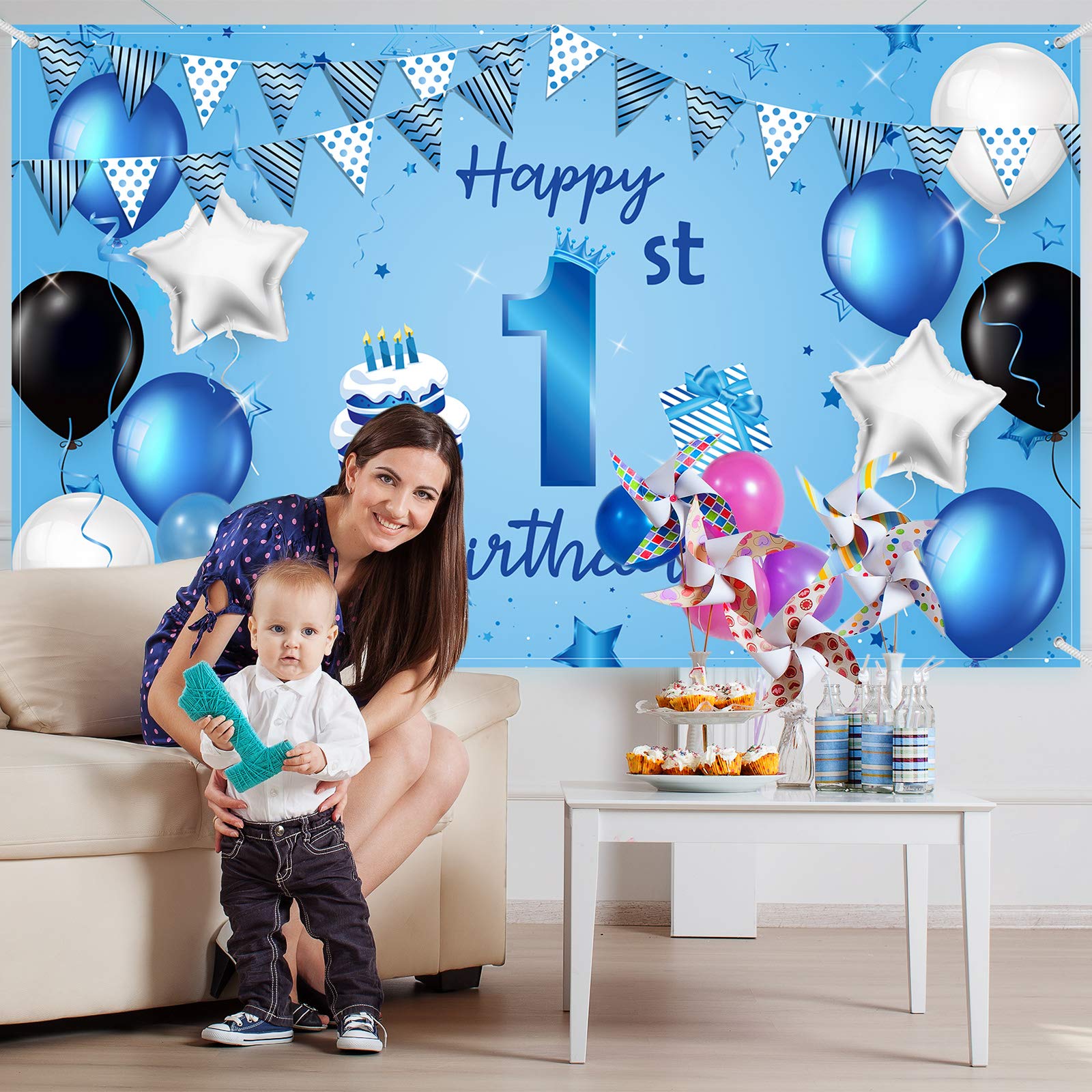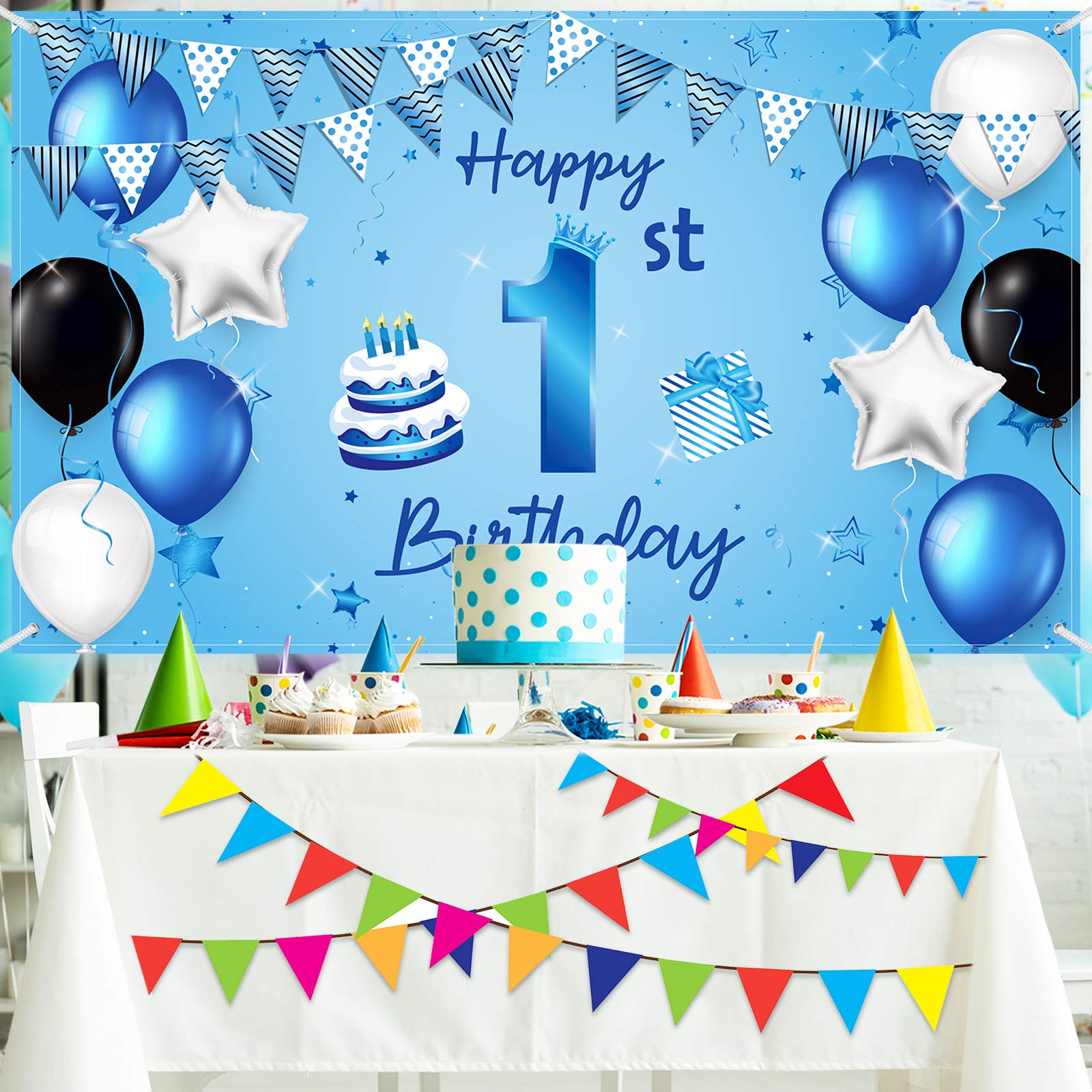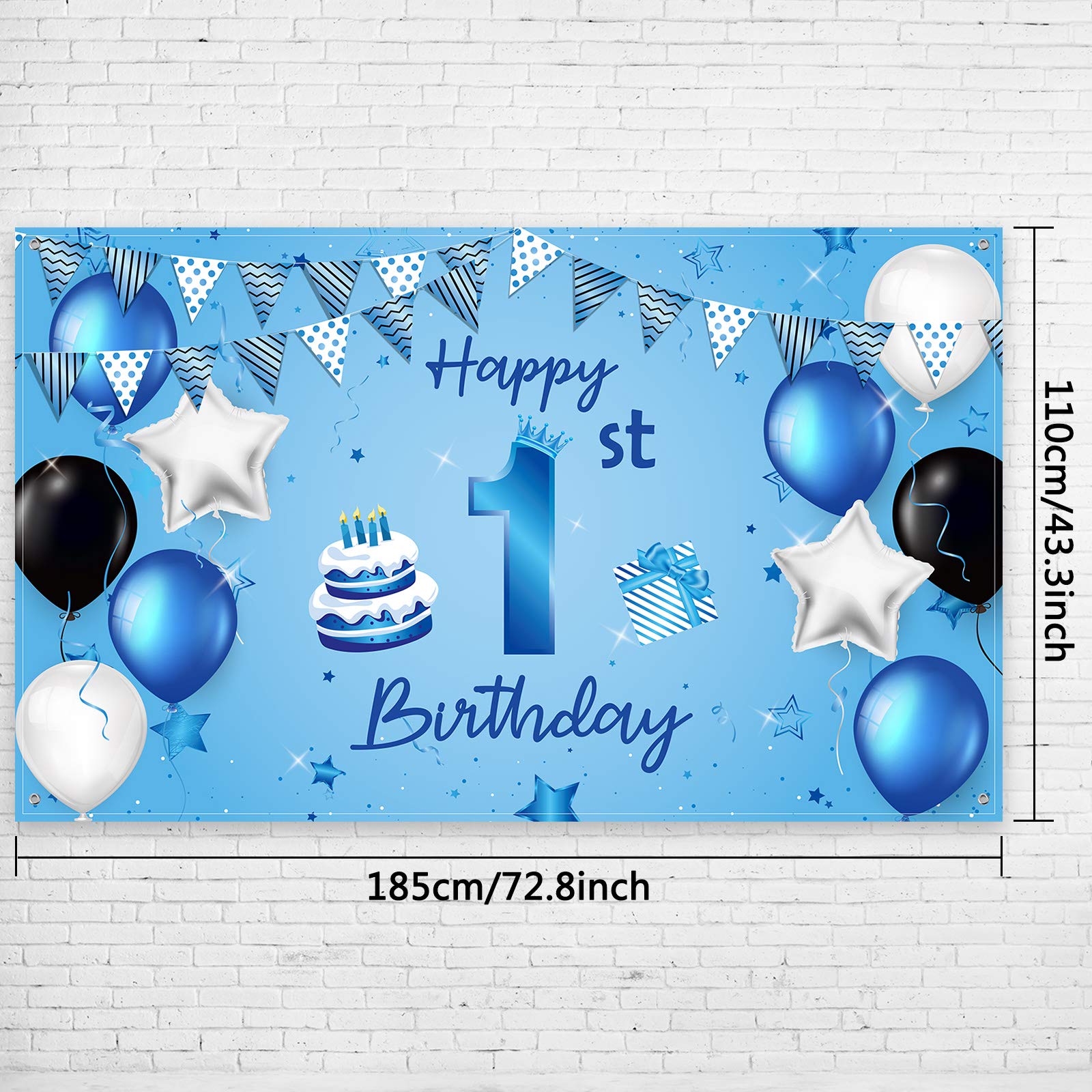 1st Birthday banner: this extra large 1st birthday background banner is designed with blue as the theme color, elegant design plus birthday elements such as cakes, gifts, balloons, flags, etc.; Sweet and cute patterns help create a stylish party background and hold an unforgettable birthday party