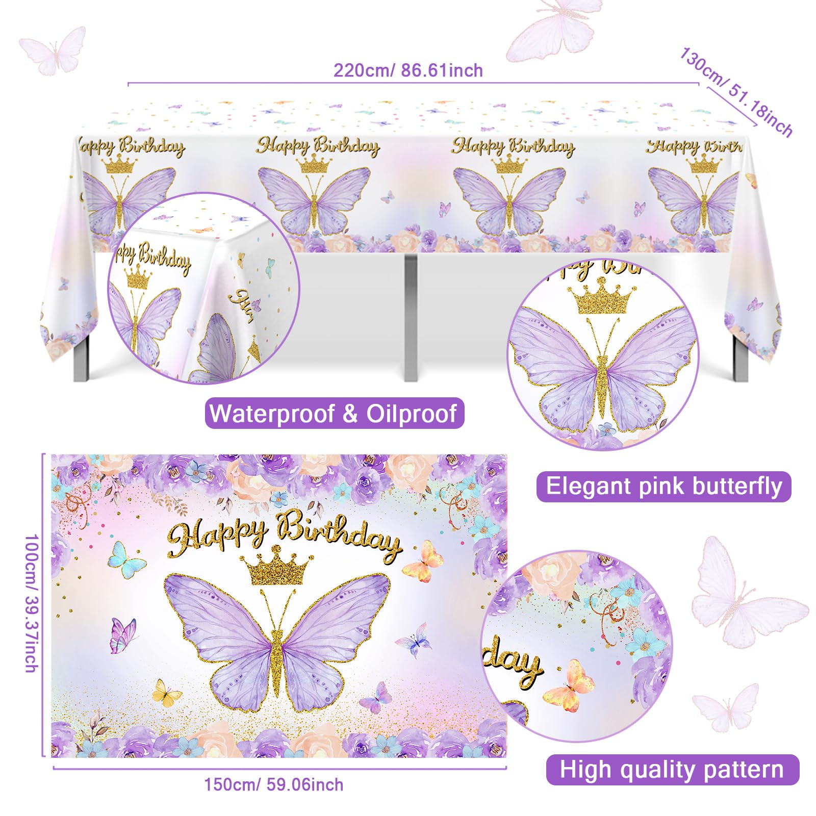 Banner and Tablecloth - Butterfly backdrop measures 59.06 x 39.37 inches/150x100 cm, purple butterflies and flowers, printed with a large "Happy Birthday"; Disposable butterfly tablecloths measure 86.61 x 51.18 inches/220x130 cm, suitable for up to 24 people, quickly cleaned up after use; birthday banners and butterfly tablecover are made of thick fibers with bright colors and clear printing, perfect decoration kit for a girl's birthday party