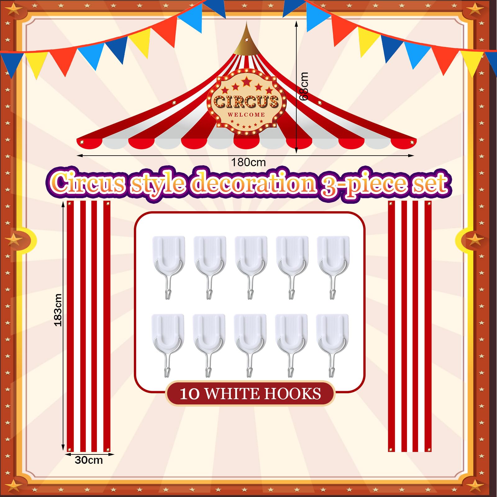 Packing List: you will receive 1 piece of circus awning decoration with circus printed sign pattern, 2 pieces of red and white striped carnival banner with a length of about 72 inches, with 1 roll of double sided adhesive for easy hanging and easy pasting