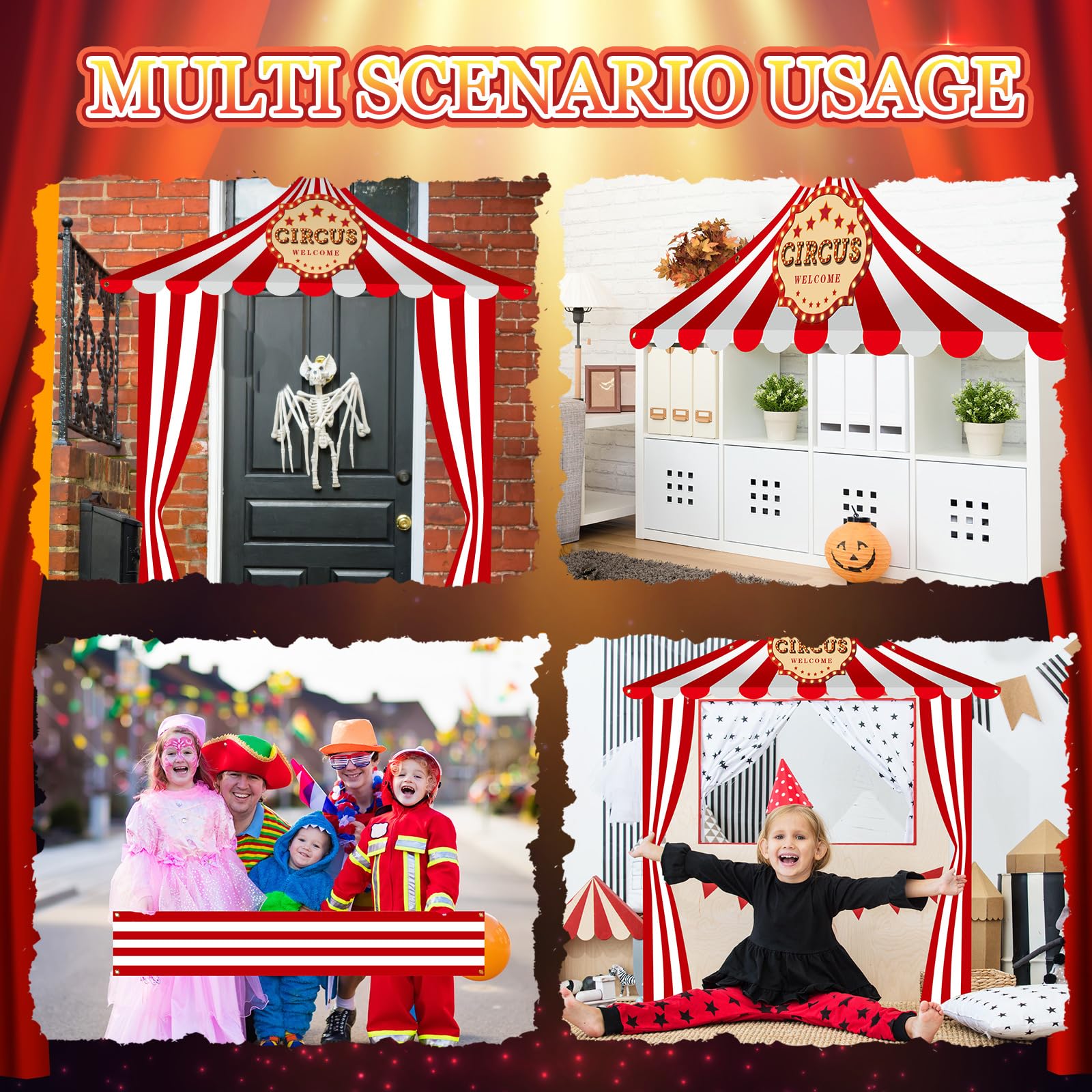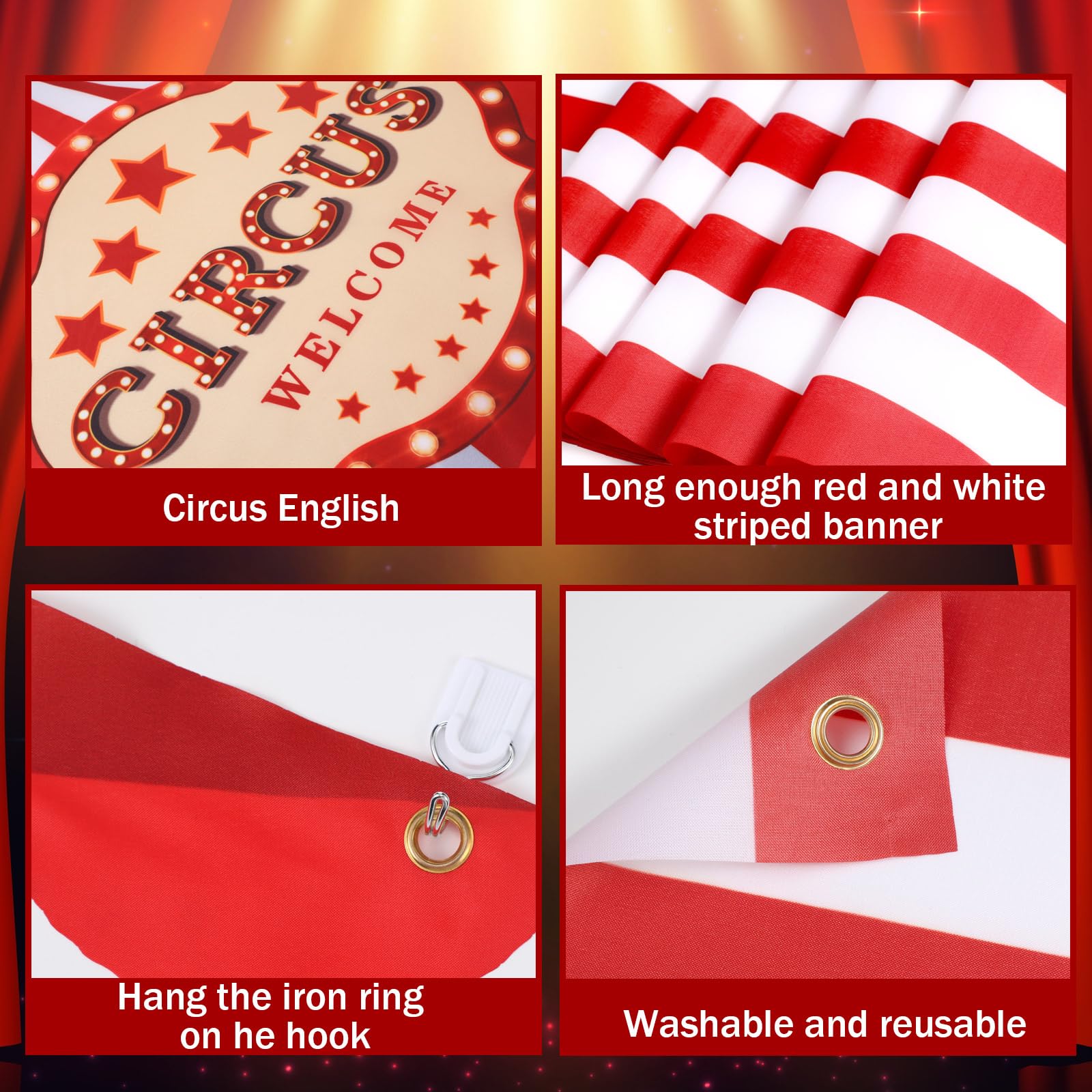 Easy to Install: Paired with a hook, tear off the back sticker and hang it on the wall with a background clothcarnival decorations are made of polyester fabric, which can be folded and adjusted; The red and white striped banners are light and washable, easy to carry, not easy to deform and tear, very suitable for carnival theme parties