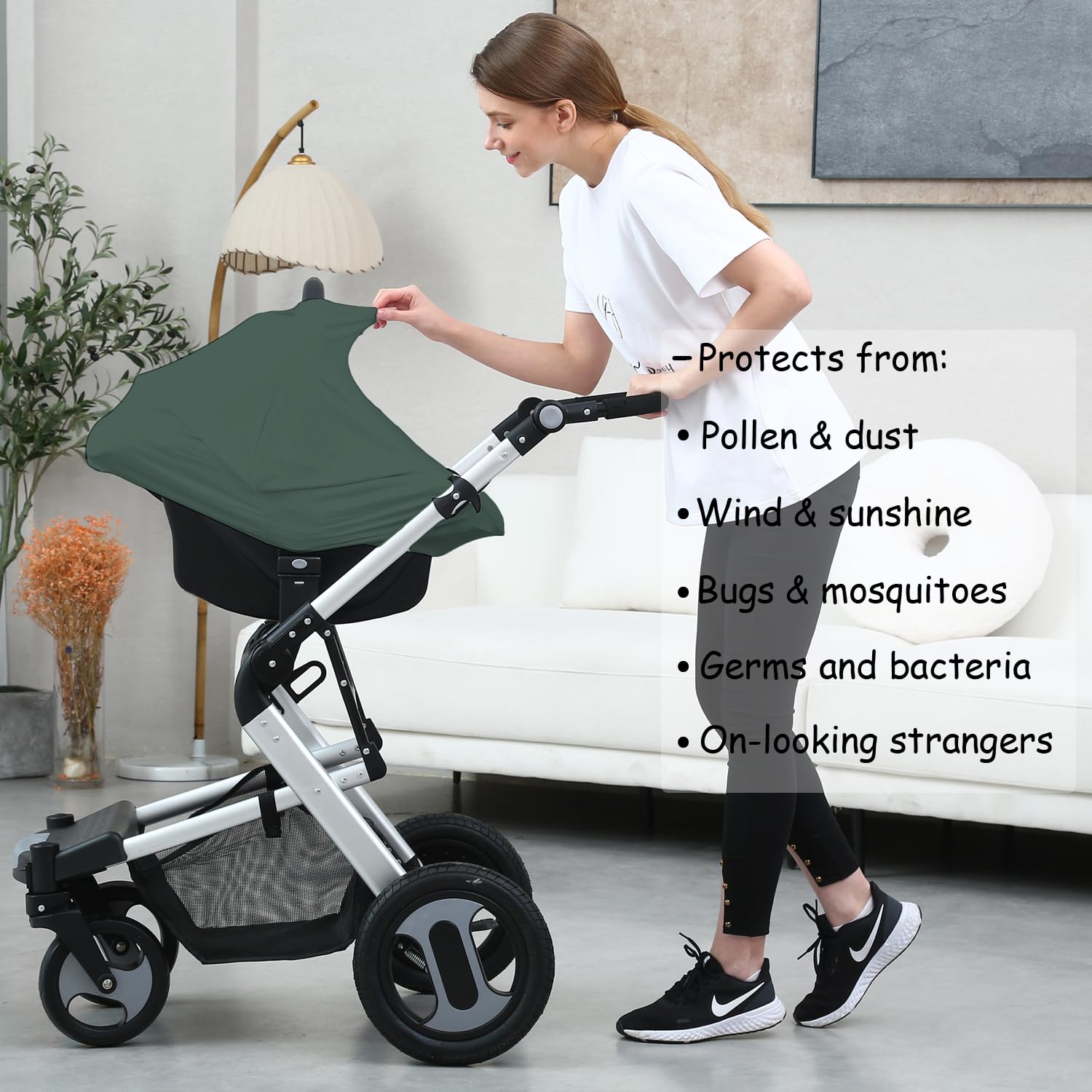 BREATHABLE & STRETCHY FABRIC: Our car seat cover made of buttery soft, breathable and stretchy premium quality fabric that is specially designed to provide maximum airflow (top have a open hole). It's doesn't need any zippers / snaps to fixed on the carseat, it's very easy to use. 27.45 * 25.39 inches size provides full coverage and enough space while nursing. Create a cooling, soft and quite environment for your baby.