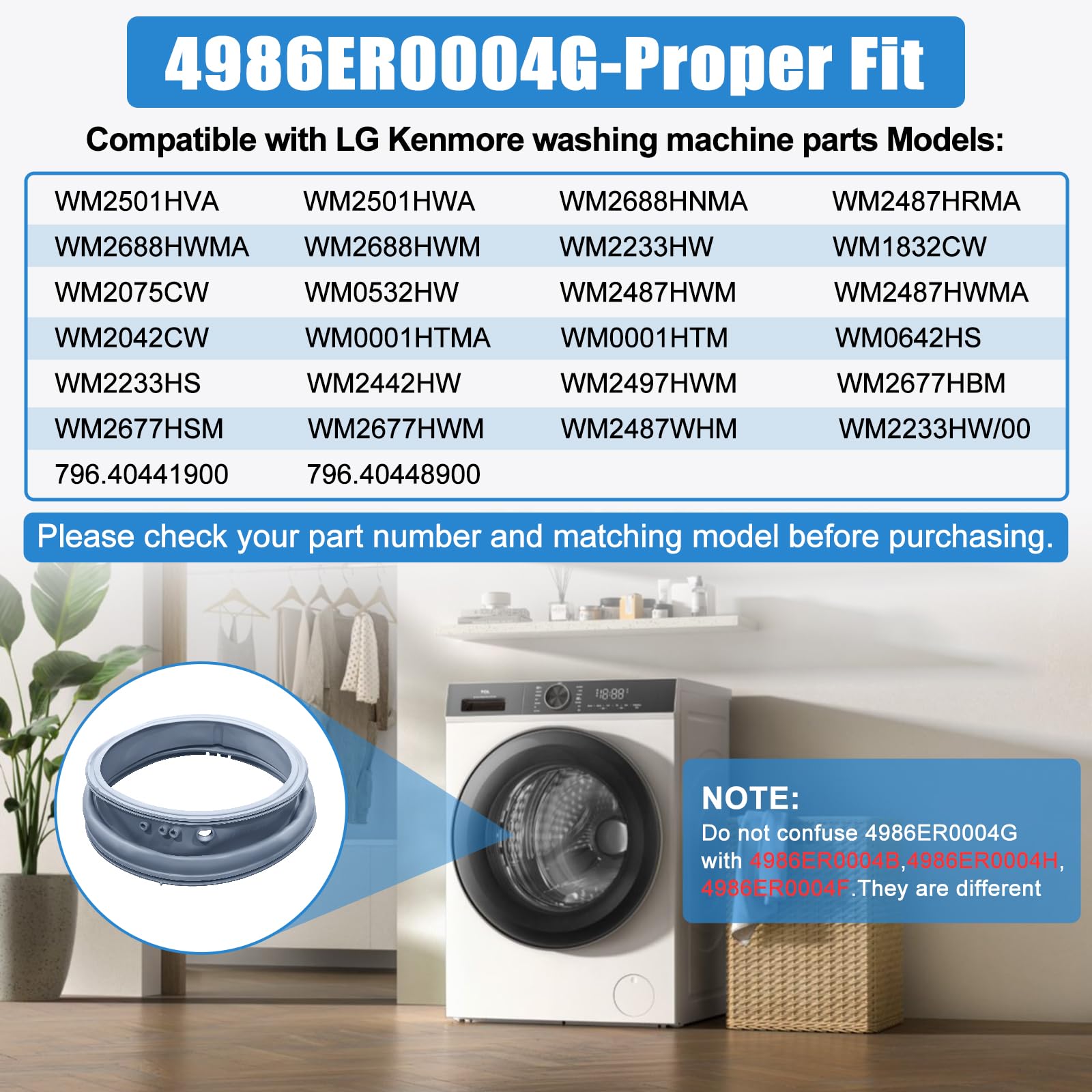 【4986ER0004G Washer Door Seal Compatible Models】This 4986ER0004G washer replacement seal for LG,Kenmore washer door gasket to ensure a perfect fit. Suitable for LG front-loading washing machines:WM2501HVA, WM2501HWA, WM2688HNMA, WM2487HRMA, WM2688HWMA, WM2688HWM, WM2233HW, WM1832CW, WM2075CW, WM0532HW, WM2487HWM, WM2487HWMA, WM2042CW, WM0001HTMA, WM0001HTM, WM0642HS, WM2233HS, WM2442HW, WM2497HWM, WM2677HBM, WM2677HSM, WM2677HWM, WM2487WHM, WM2233HW/00 Door Seal Gasket Parts Gasket.Fit for Ken-more washer 796.40441900, 796.40448900 door gasket.