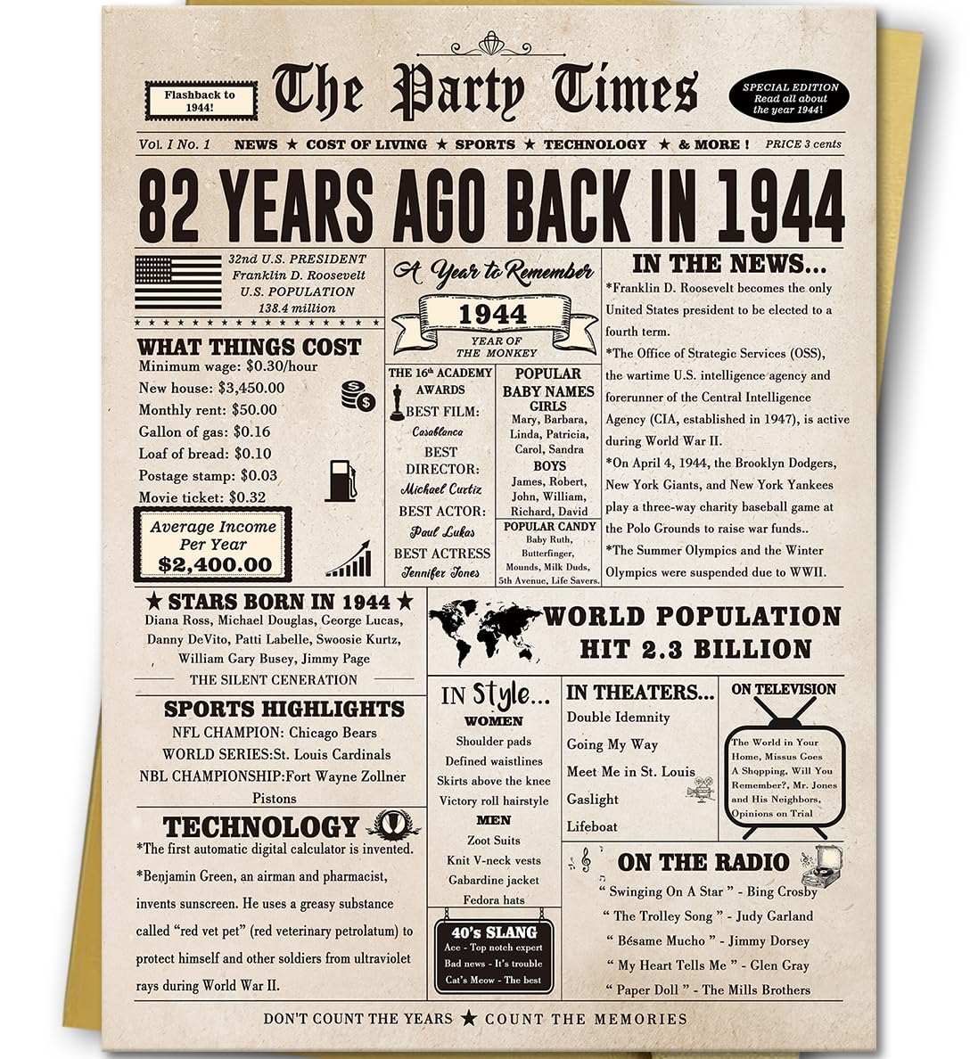 It's a great conversation piece. It's interesting to look back and see how much everything cost back then and the history of what was going on. An unique and memorable birthday gift when you don't know what to get for someone. The perfect remembrance to tuck in a gift box or gift bag. With its classic and retro style, this 82 birthday card will bring a vintage touch to your decorations, make your gift stand out. Ideal gift idea for your granddad,grandma, parents, father, mother husband, wife, sister, brother, best friend, colleagues, classmates, teachers, etc.