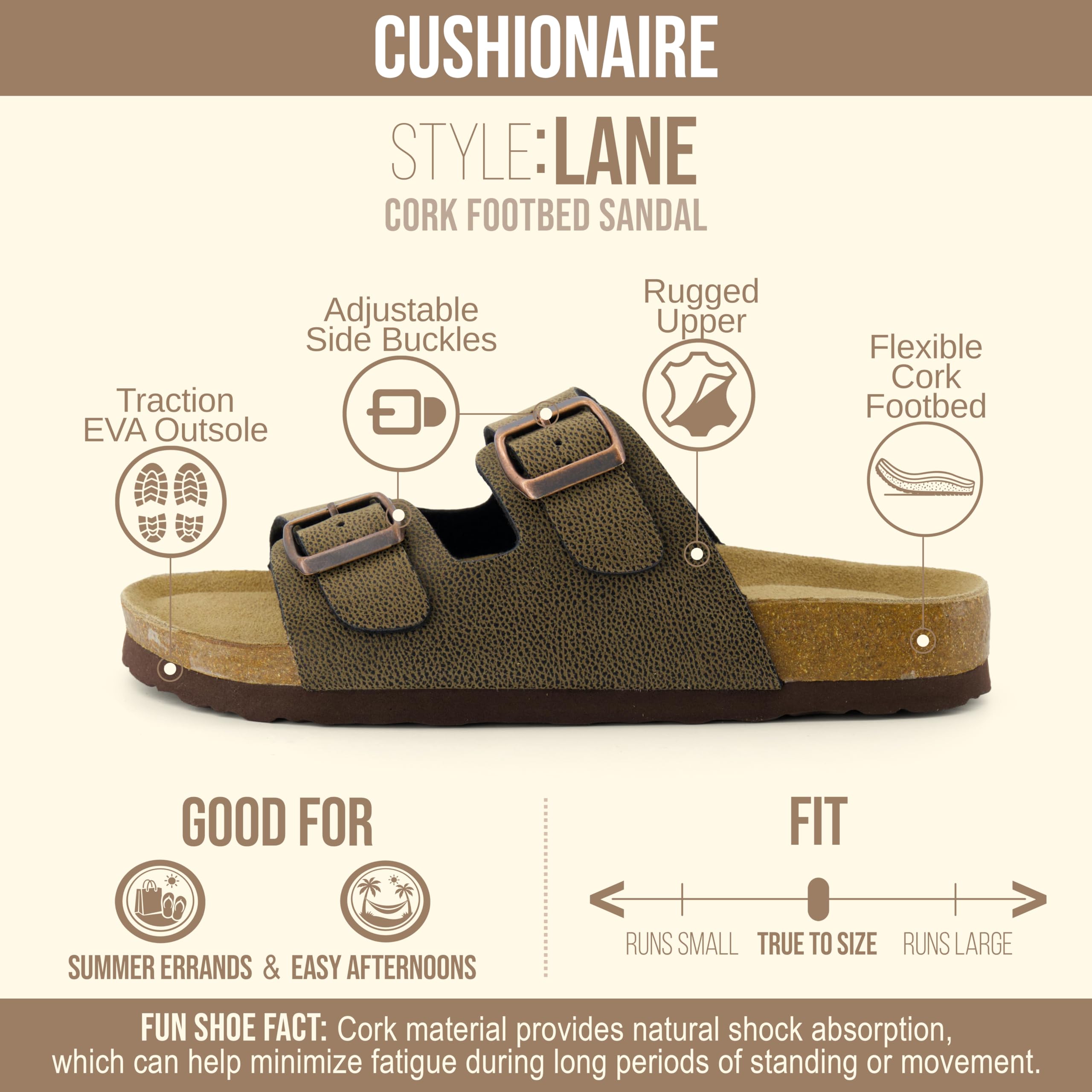 Description Women's Cushionaire comfort Cork footbed sandal. Stay cool with these high quality sandals that will give you comfort throughout your day.