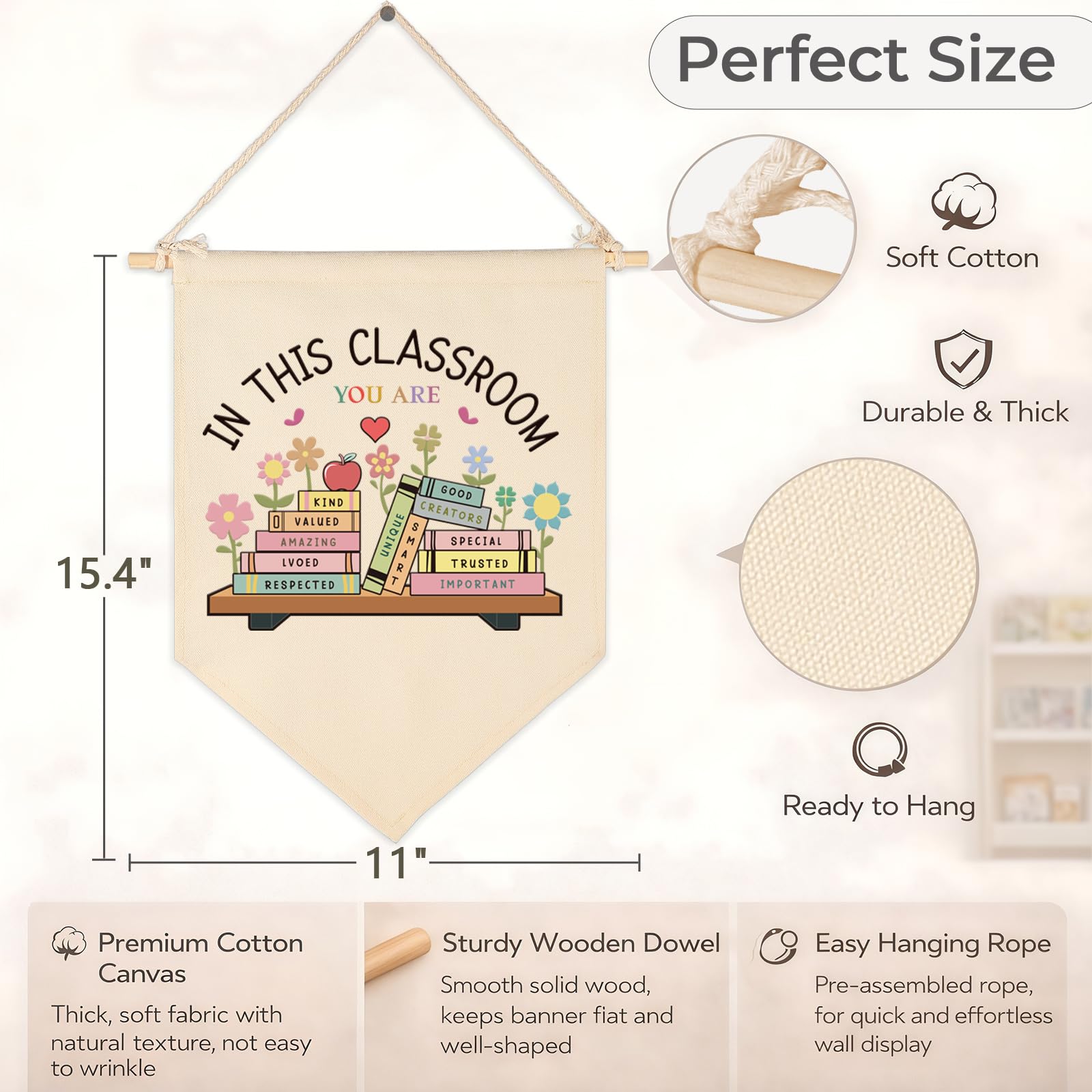 Polyester-cotton canvas material,durable,Not easy to fade;20"L×28.5"W, with a neutral beige tone,Equipped with two reinforced metal eyelets,You can use hooks or rope to quickly fix it on the wall or door;A variety of styles the rectangle banner as the gifts for Girl,boy,teen,teacher;Use to classroom,reading Room,Nursery,Psychology treatment office,teacher office,reading corner wall sign decor;Also available as the christmas,teacher appreciation week gift