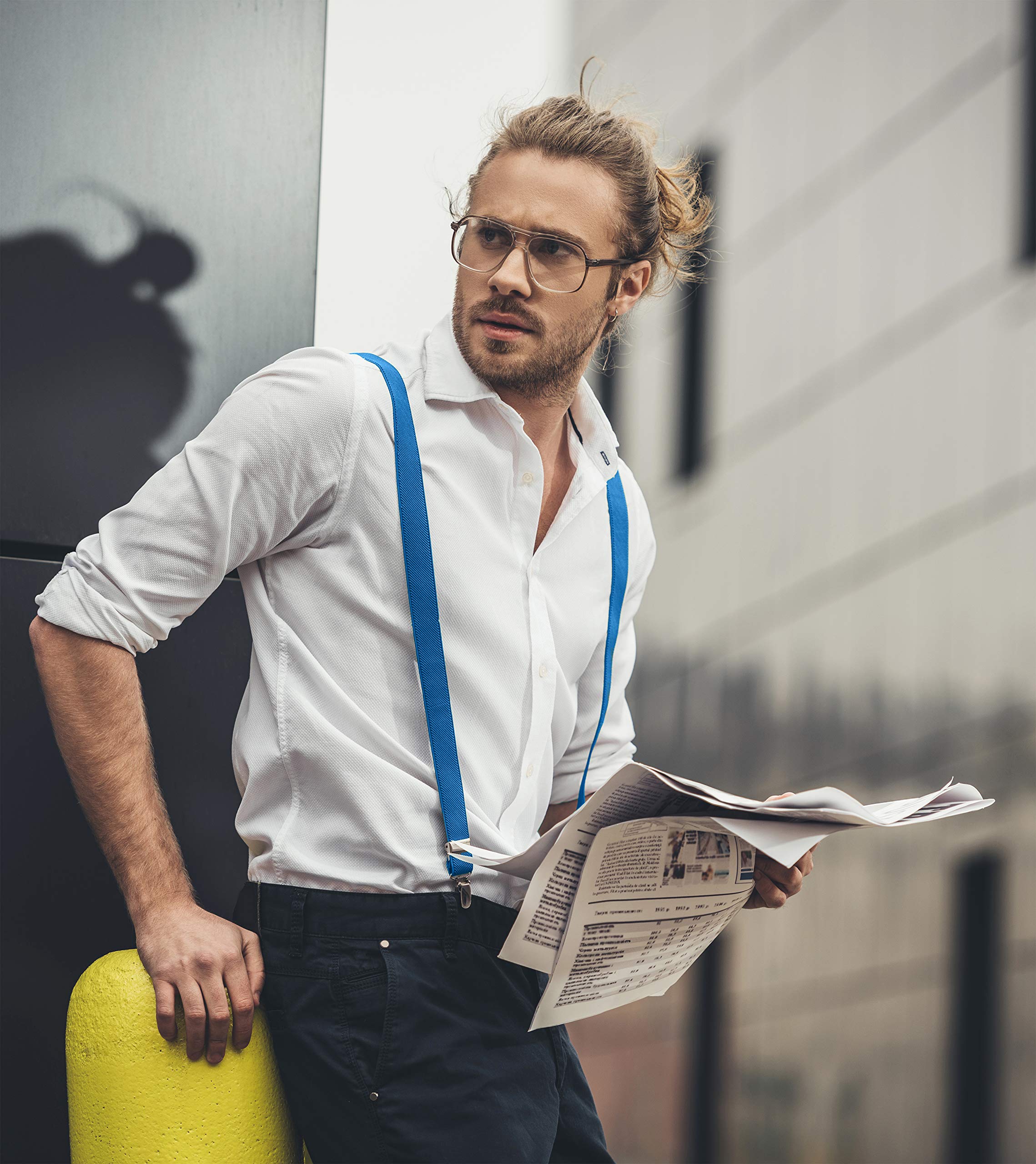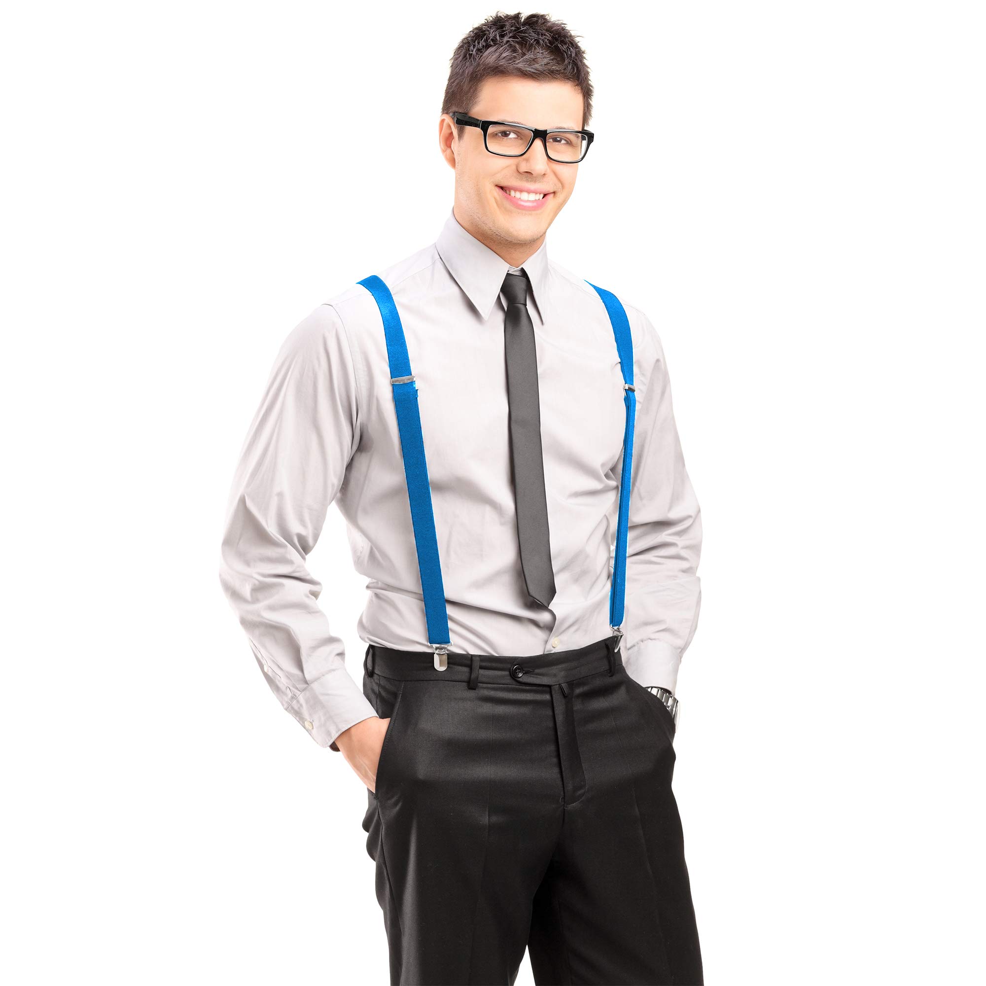 EASY WEAR COMFORTABLE: This Blue Mens Womens Suspender smooth edge shape braces provide a relaxed snug fit that wouldn't dig into your skin or damage your outfit. Synthetic leather crosspatch gives a solid Y-Back look and strong hold up for that special day. Updated heavy-duty clips superbly provide that hold so your pants, shorts, or trousers will never fall off.