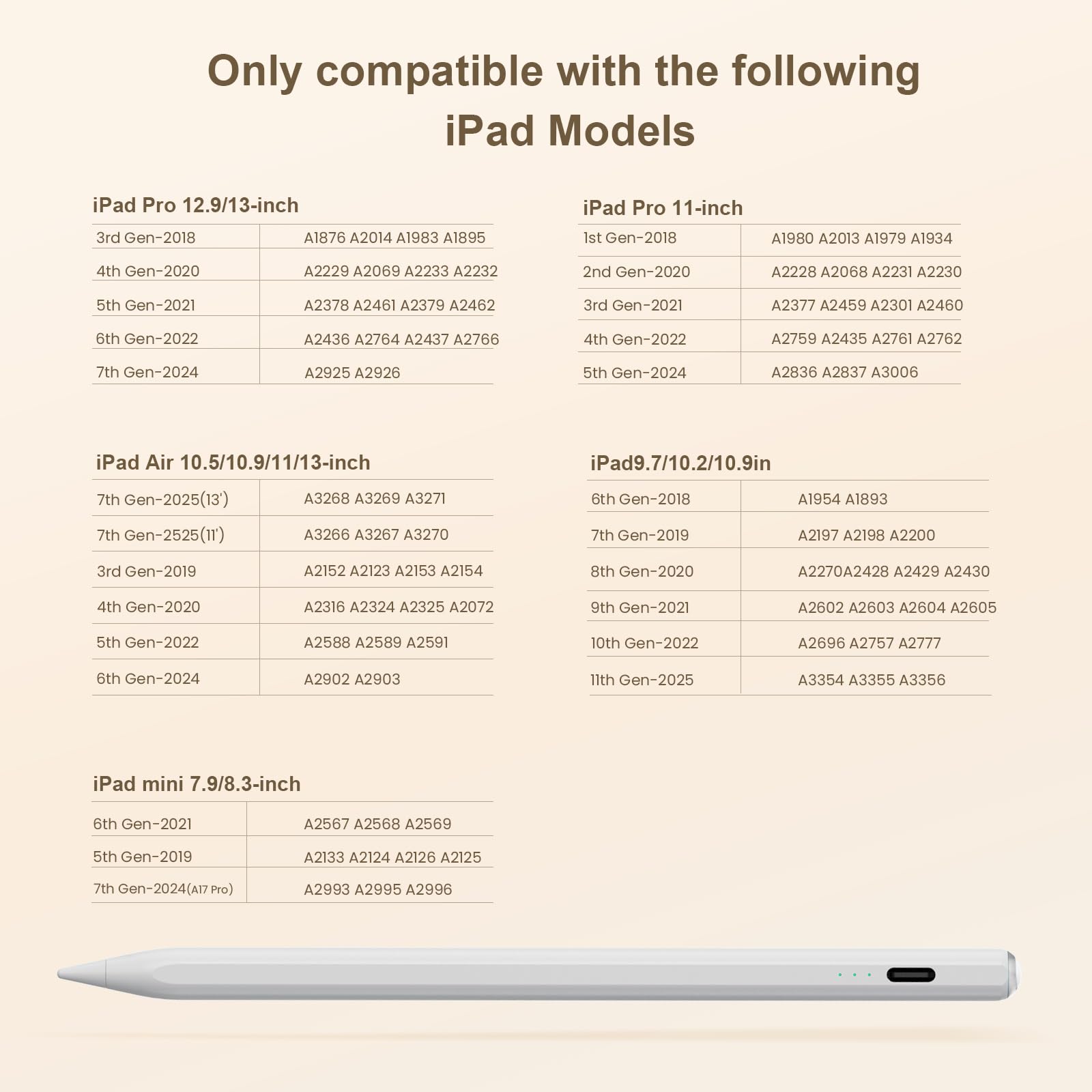 🖊【Wide Compatibility】: Stylus pen supports iPad 2018-2025 series:iPad 11th 11 inch 2025/10/9/8/7/6th Gen,iPad Air 7th 11 inch (M3) 2025/7th 13 inch (M3) 2025/6/5/4/3th Gen,iPad Pro 13 inch M4,iPad Pro 12.9 inch 3/4/5/6th Gen,iPad Pro 11 inch 1/2/3/4th/M4,iPad Mini 7th (A17 Pro)/6/5th Gen.NOTE: The Pencil is NOT compatible with iPad models before 2018, iPhone, Android and Microsoft devices. Please check your product model before placing an order.