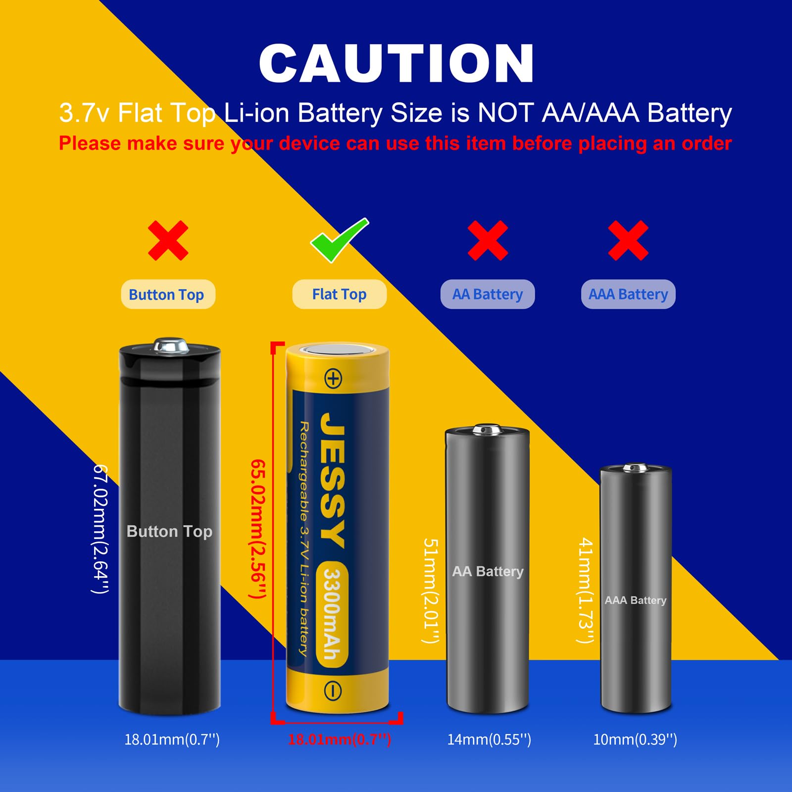 Rechargeable battery: JESSY 3.7V rechargeable Battery, this is flat-top rechargeable Batteries, Size 18 * 64.9 * 18mm (2.56*0.7*0.7inch), the Size is NOT AA/AAA battery, please confirm the battery size and battery type before purchase