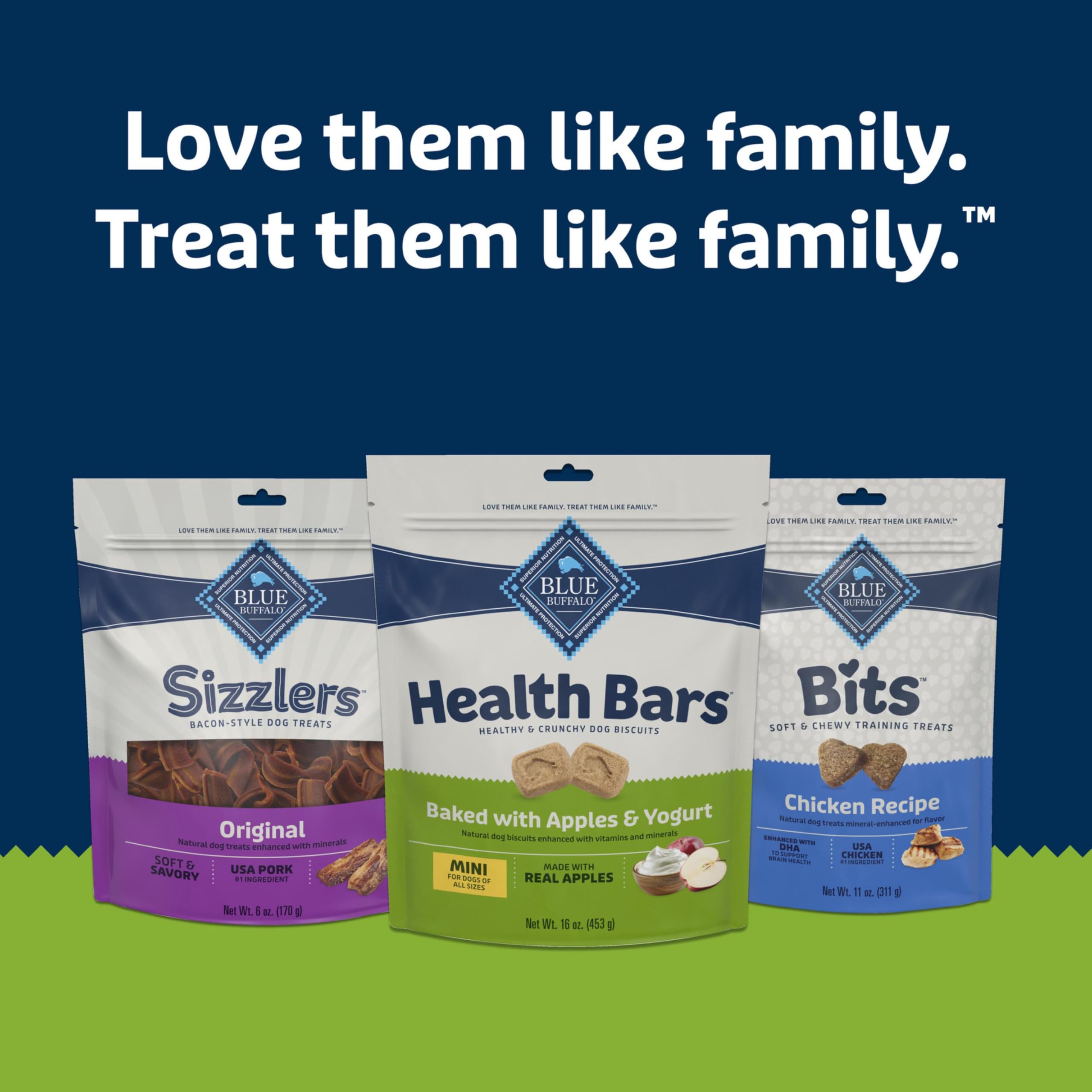 A classic cookie for discerning Pet Parents, Blue Buffalo Health Bars Mini dog treats deliver the great taste and satisfying crunch our furry friends love in a smaller size — without the corn, wheat, or soy you might find in other biscuits. Blue Buffalo Health Bars contain real, mouthwatering ingredients with the flavors and aromas of your own favorite foods. Combining the scents of oven-baked apples, cinnamon, and yogurt, this recipe evokes wholesome and sweet apple pie. These crunchy dog treats let you satisfy those cravings while keeping your food to yourself. BLUE Health Bars are great for all breed sizes, and they are easy to break into smaller pieces for training or a tasty reward. Made with the finest natural ingredients, enhanced with Omega 3 fatty acids and antioxidants, and oven-baked for a big crunch, these treats are as healthy as they are tasty!