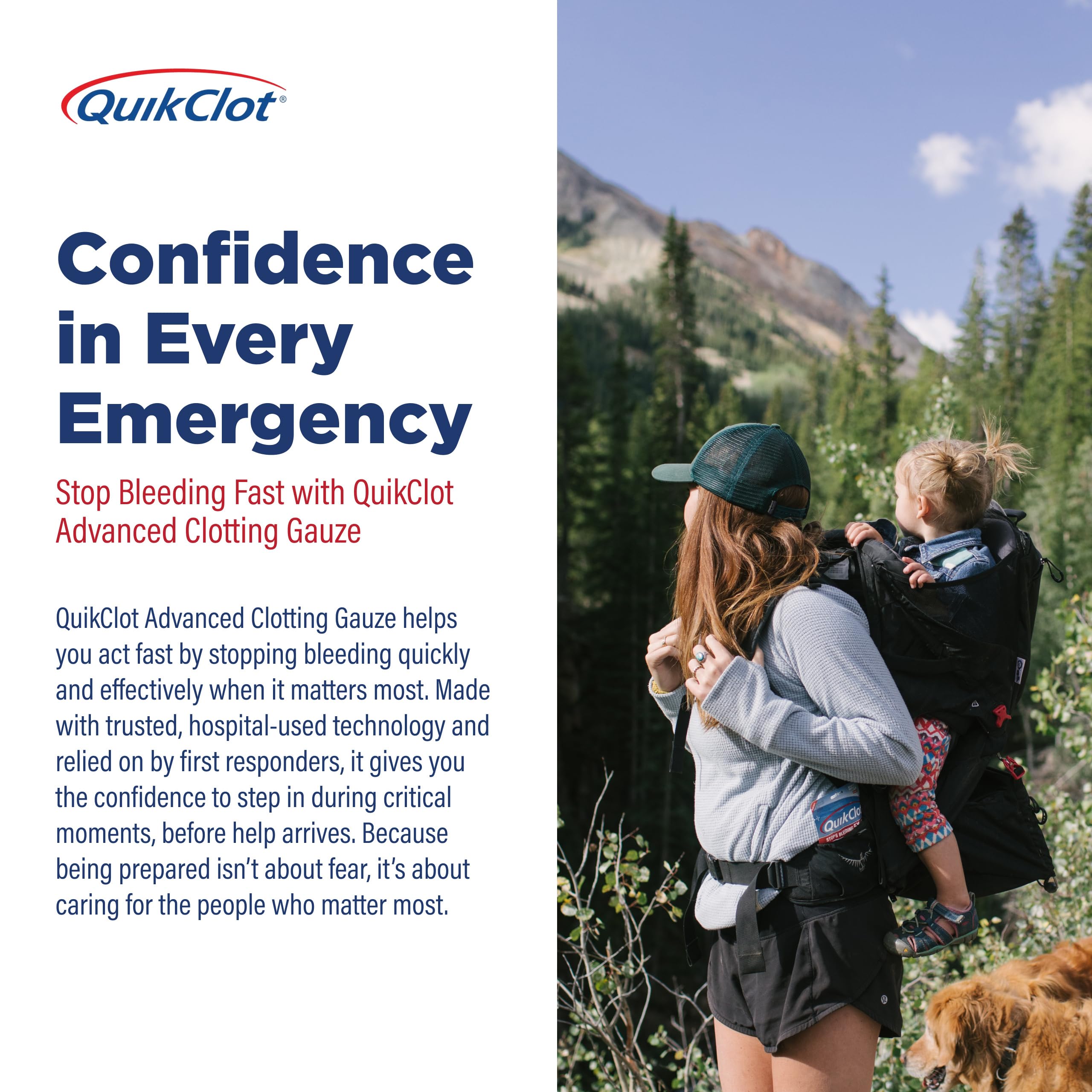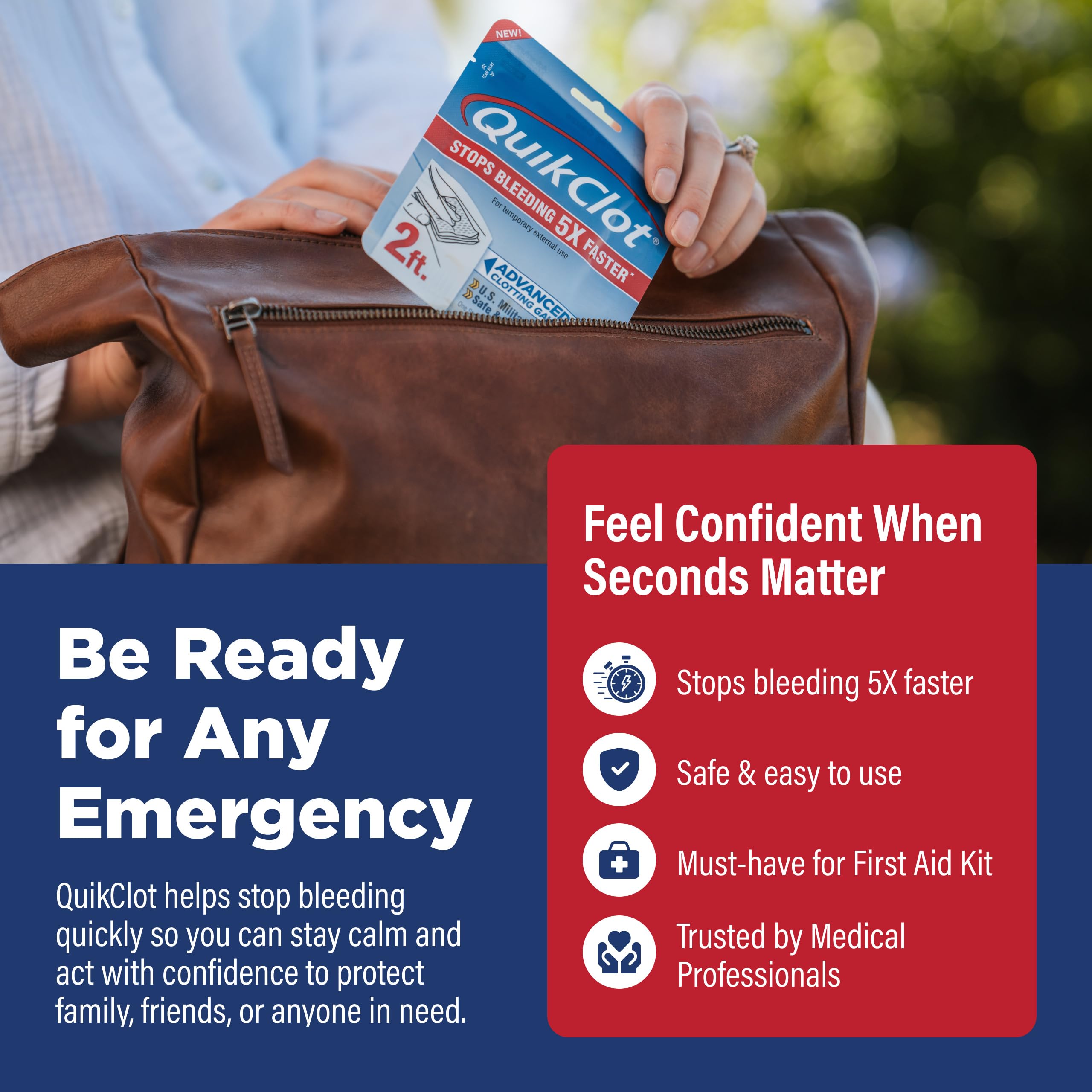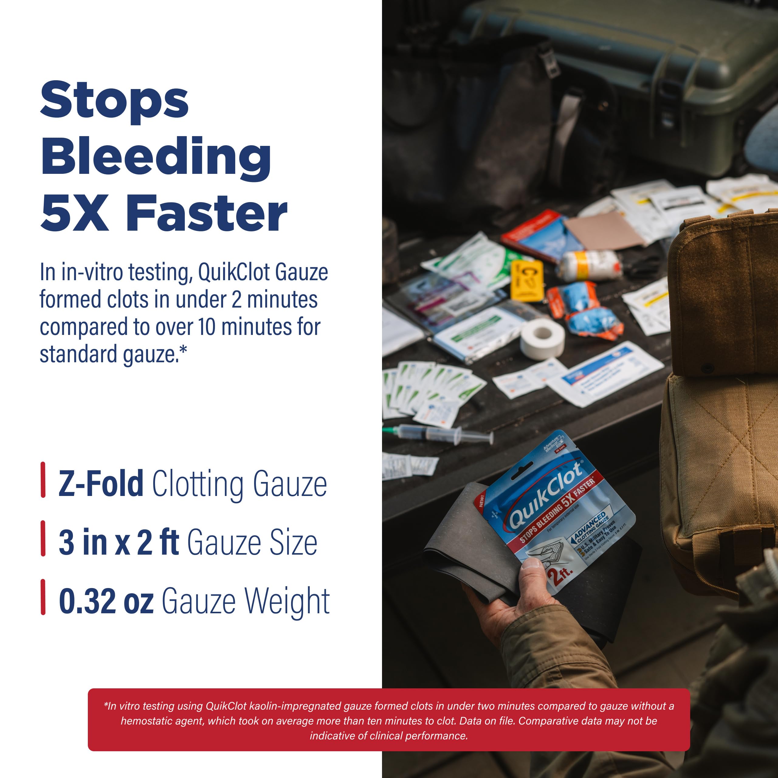 Stop Bleeding Fast: Control bleeding with QuikClot hemostatic gauze, which acts to stop bleeding 5 times faster; gauze is impregnated with kaolin, a mineral that accelerates natural clotting process