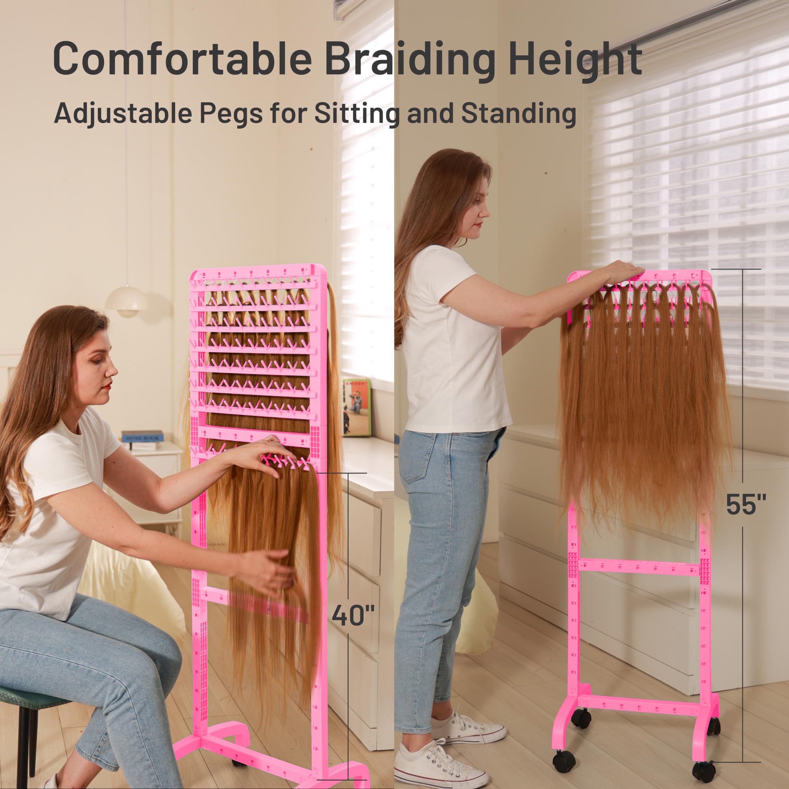 Customized Hair Rack: Removable whole rows of pegs are designed so that you can customize the height and gap of the pegs as you like, and you can also install them one or two sides to maximize your needs, whether you are standing or sitting you will be able to adjust the pegs to a comfortable height, ergonomic, and bring you a better hair braiding experience