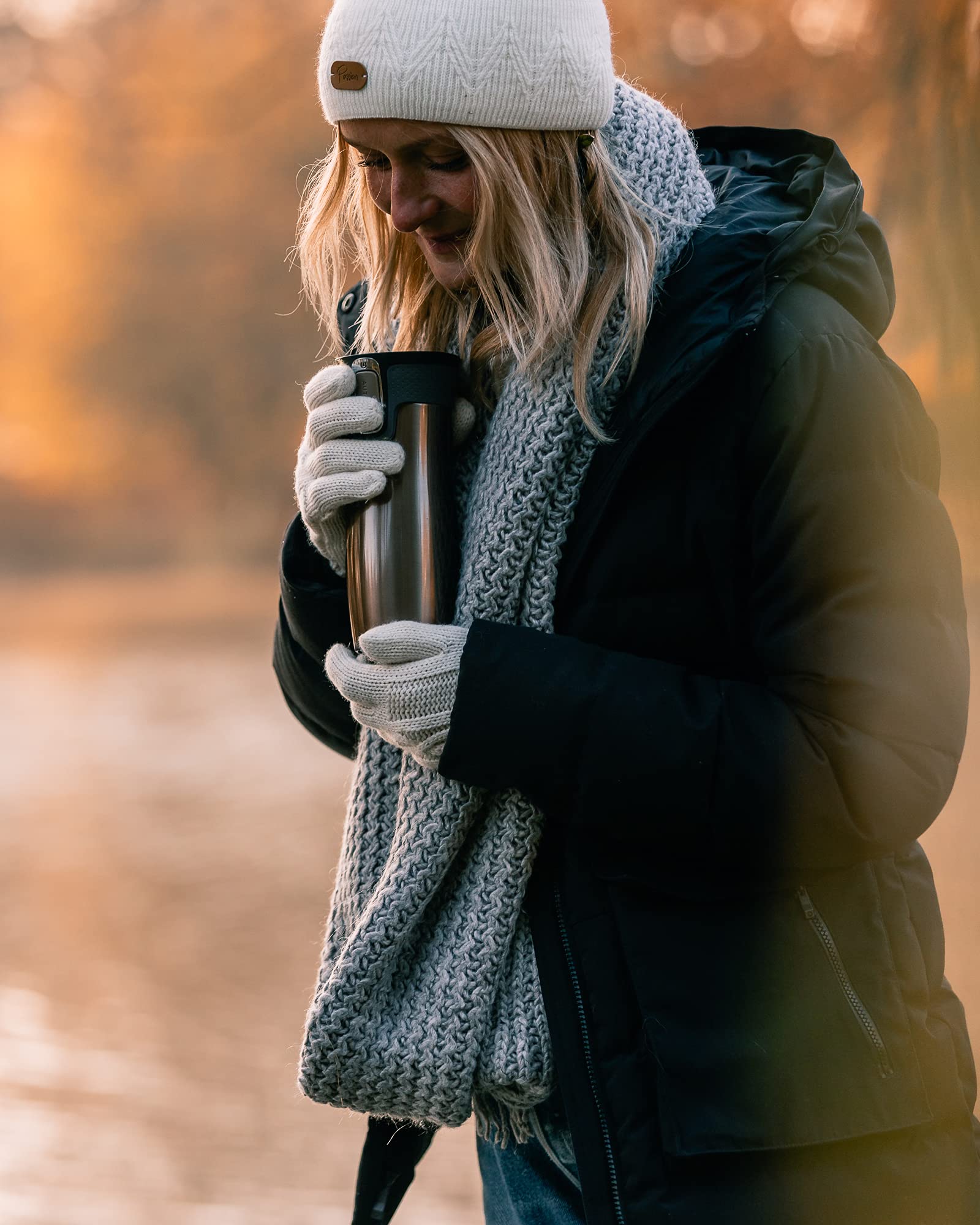 IDEAL FIT: The sustainable and environmentally friendly stainless steel thermal mug fits into all common car cupholders; size 9.2 x 8.9 x 19.7 cm
