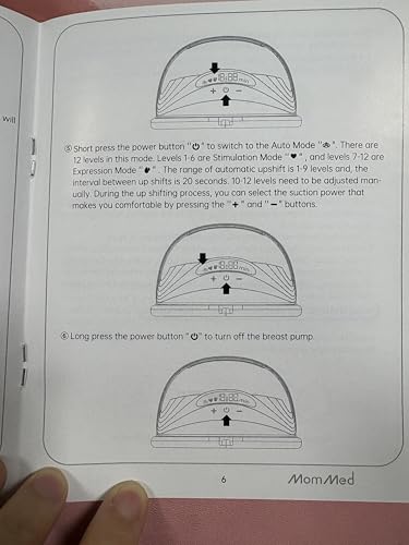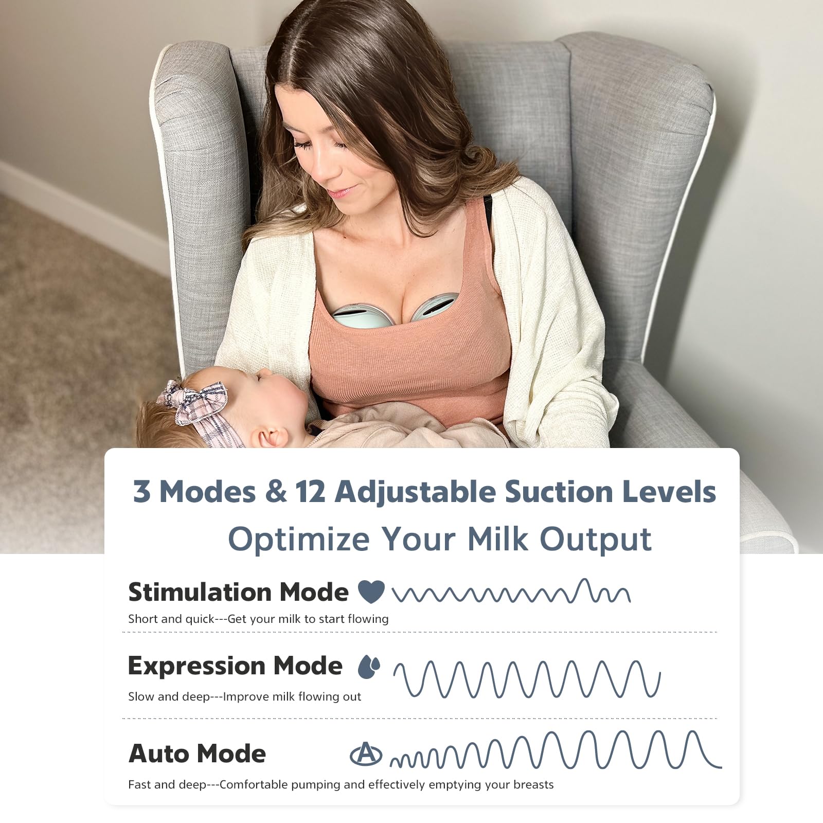 【2 x Upgraded Wearable Breast Pump】- MomMed breast pump has 3 modes and 12 levels for better imitating the baby's sucking motion. Moms can combine different modes and levels to optimize milk production in the most efficient and comfortable way, safe and painless. Mode selection: Stimulation, Expression, and Auto Mode