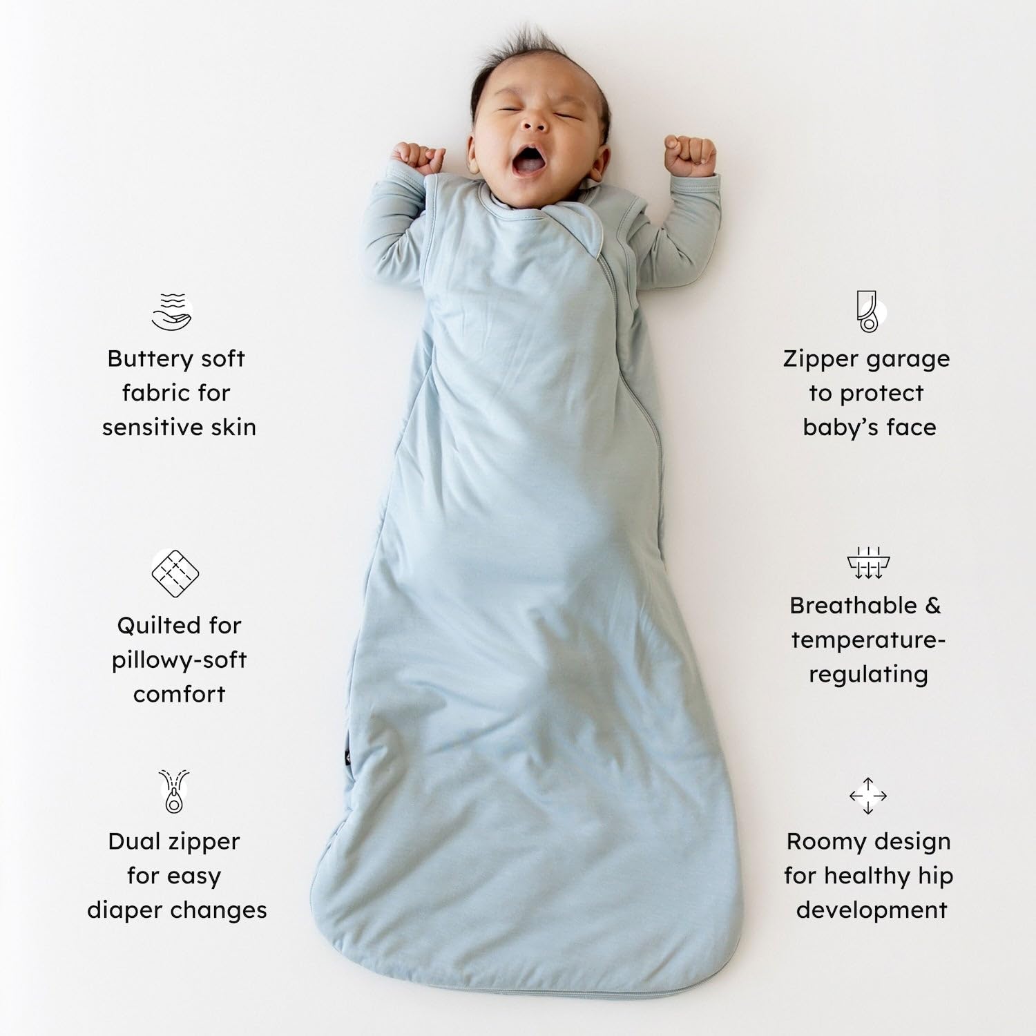EASY AND SIMPLE TO USE - Our Sleep Bags Feature a Double Zipper that Zips from the Neck Down or Bottom up, Making Night Time Diaper Changes Easy and Fuss-Free. The Top Zipper Has an Enclosure Over it, Reducing Risk of Choking or Scratching of the Baby's Face. Continuing with Safety First, Kyte BABY Sleep Bags are Free of Any Unnecessary Embellishments Which can be Pulled Off and Put in the Baby's Mouth