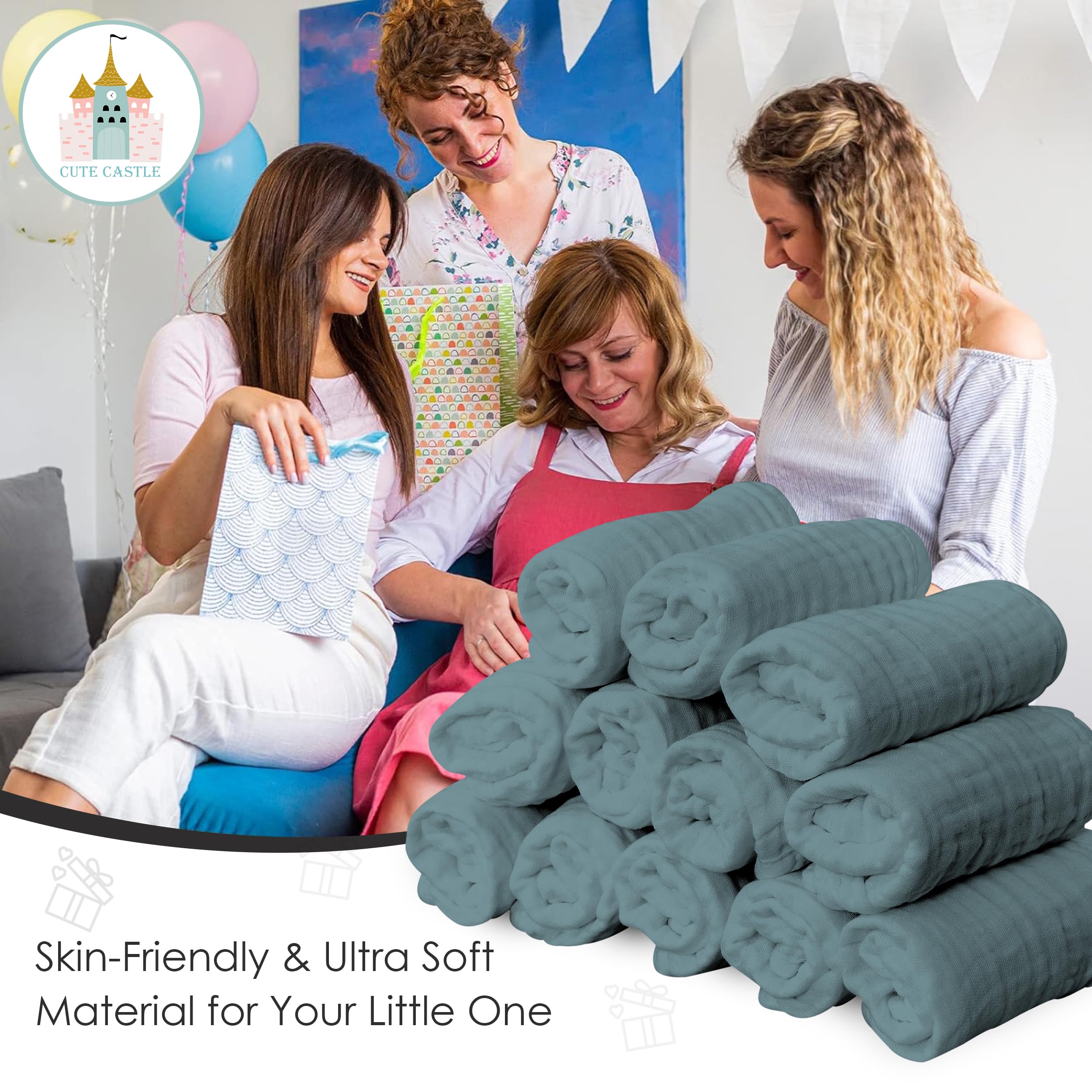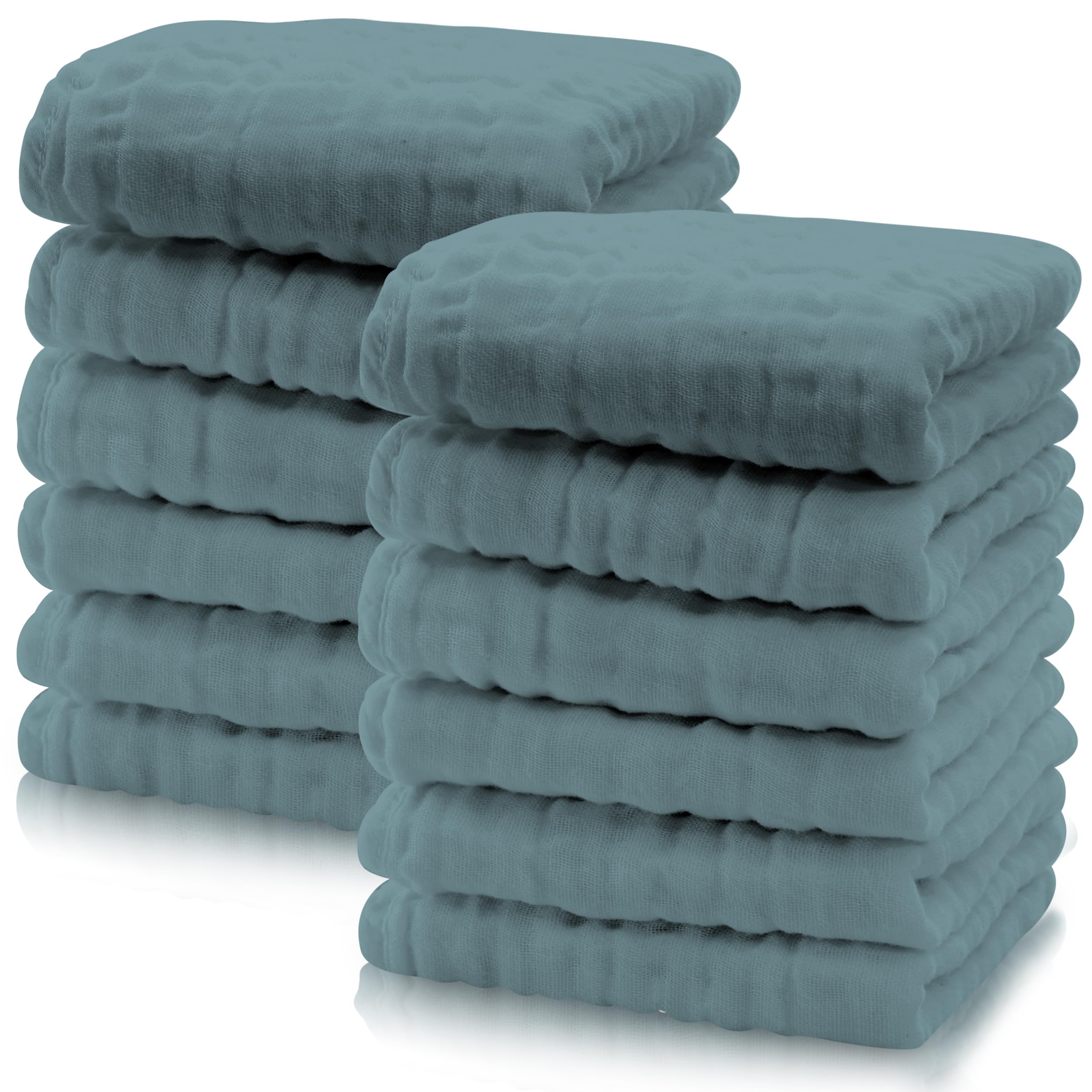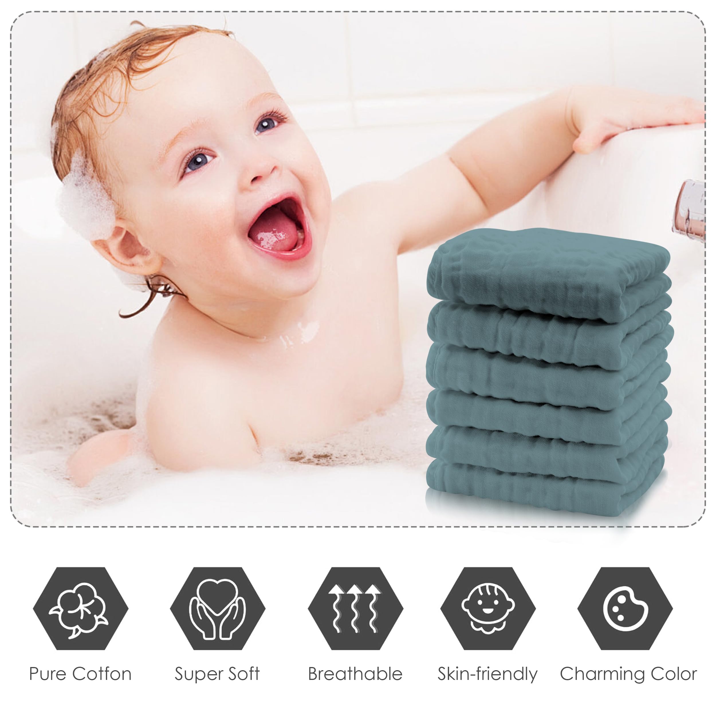 【Package Content】12-pack of Muslin Baby Washcloths, 12 x 12 inches, perfect for all your baby's bathing needs.