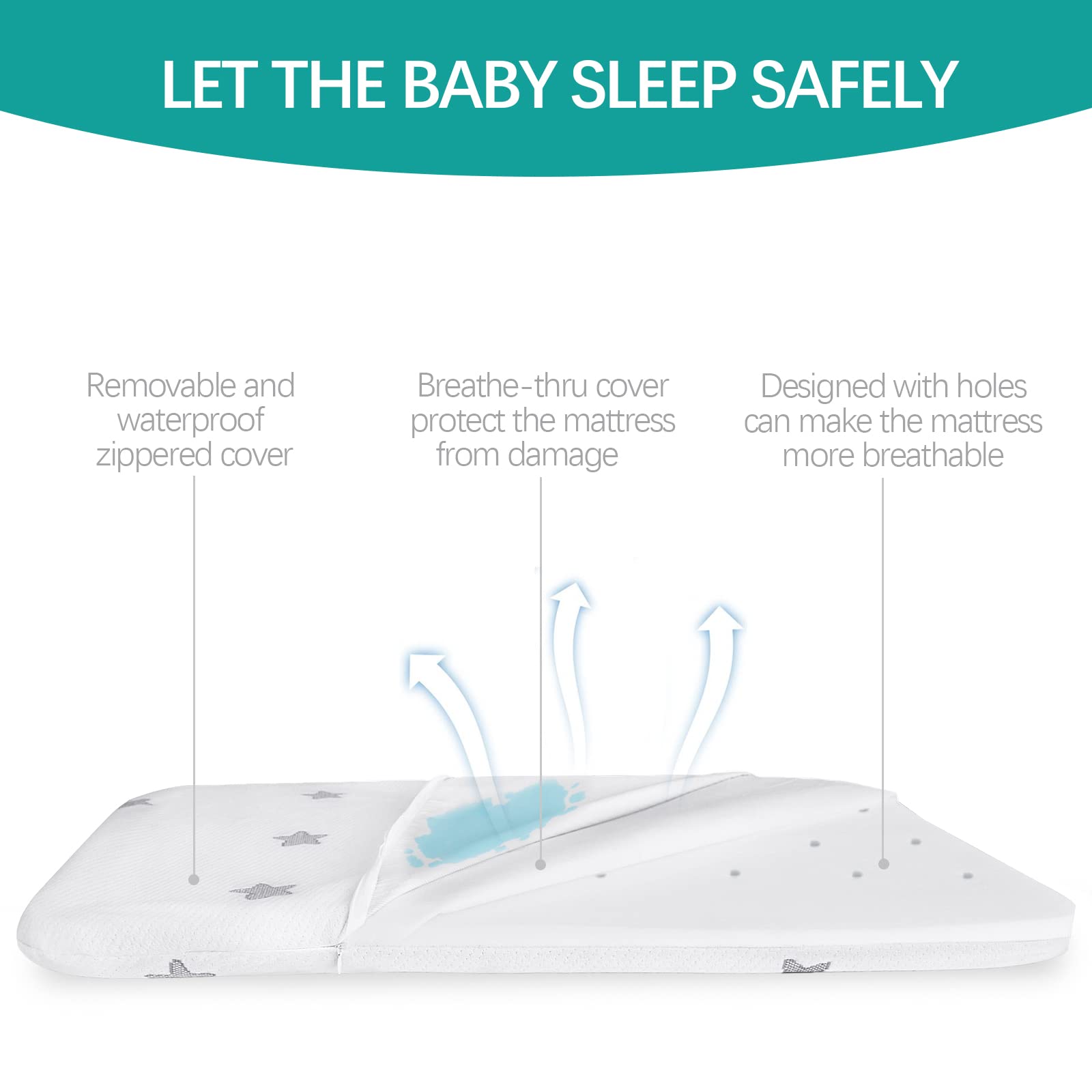 Removable and Waterproof Zippered Cover: Removable soft OEKO-TEX standard 100 certified cover with cute star print and TPU waterproof layer that can be washable and extremely soft to the touch for your baby, you never have to worry about accidents and keeping your bassinet mattress pad clean.