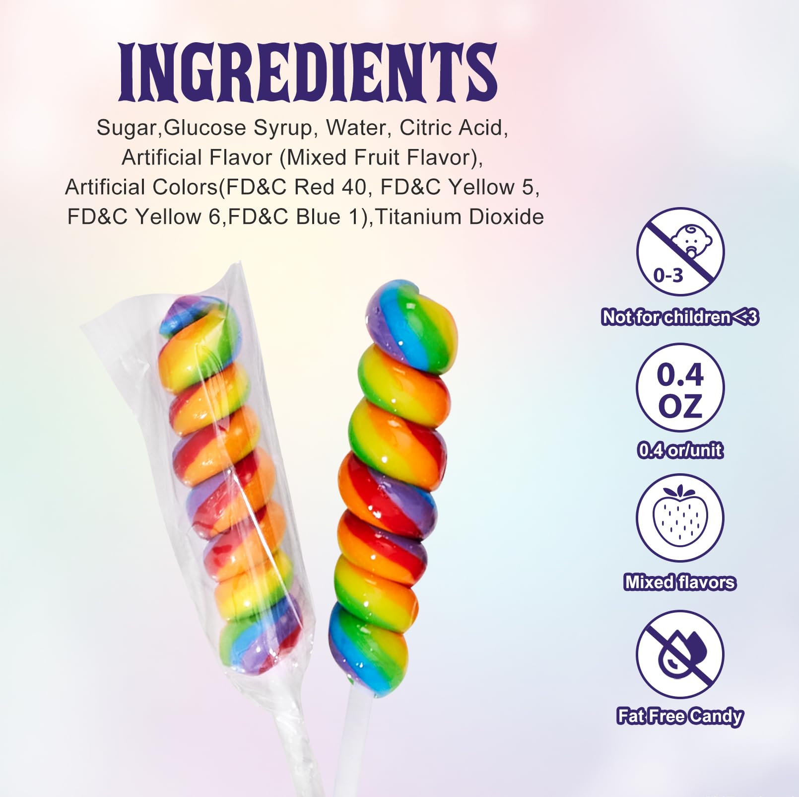 2.5 Inch Suckers:Experience a jolt of 5 intense rainbow flavors. From classic original Mixed fruit flavor to Cherry flavor, Strawberry flavor, and more. Try them all out and find your favorites!