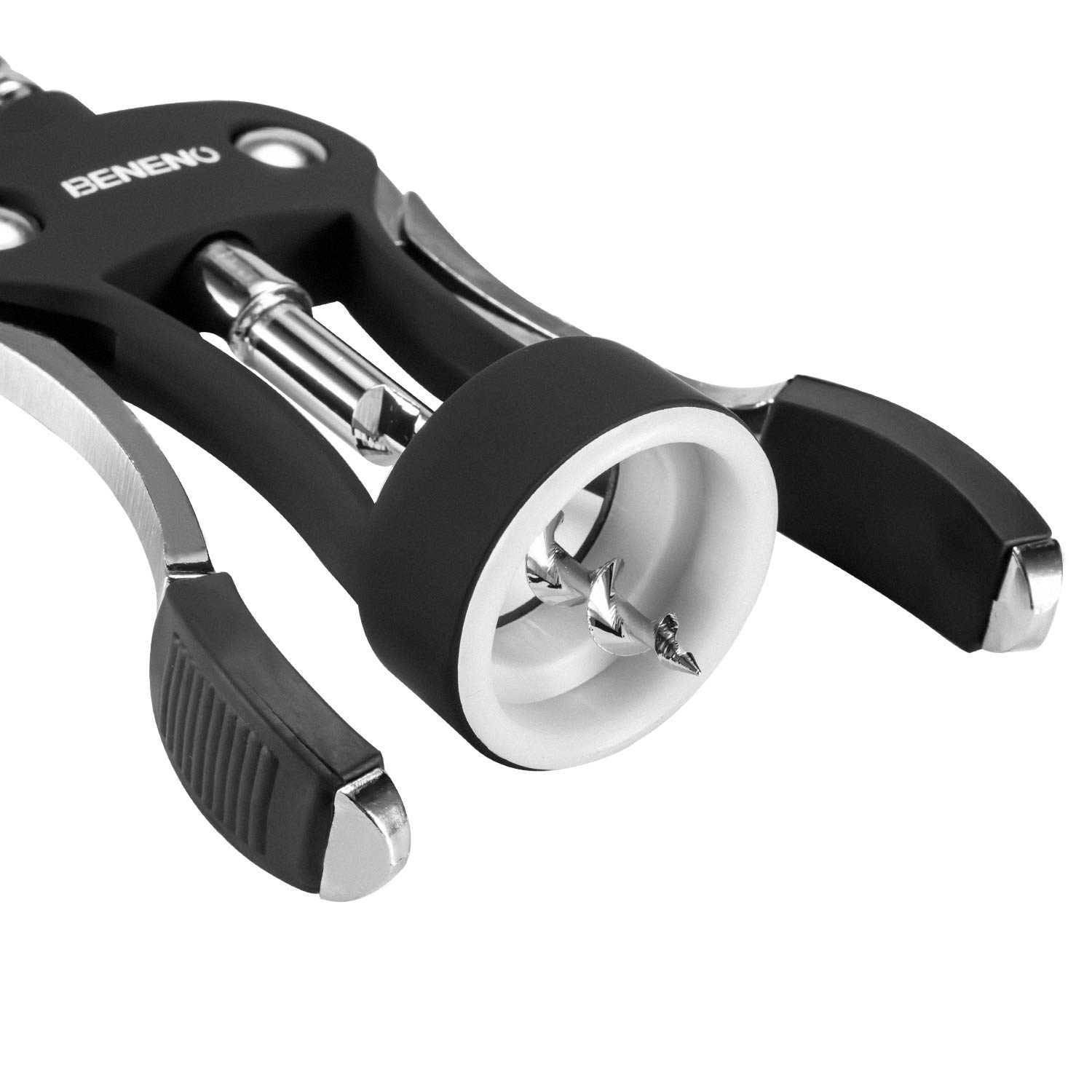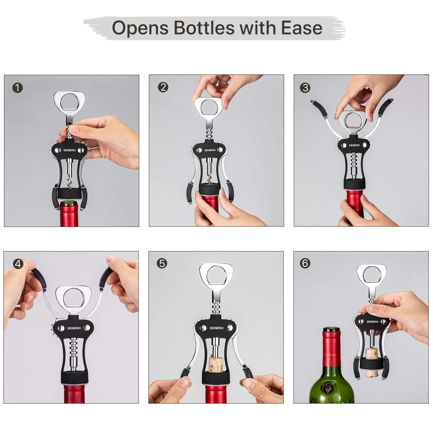 ADVANTAGES OF BENENO WING CORKSCREW Built-in Bottle Opener - Multifunctional opener for bottles Mechanical Gear Design - Stays centered and prevent slippage Stable Revit Design - Fixation and durable for pull and press Ergonomic Grip Design - Comfy and contoured easy-grip Sharp-edged Screws - Keeps corks from breaking OPEN BOTTLES WITH EASE Focusing your BENENO corkscrew on the middle of the cork Rotating the handle to put the screw into the cork Keep rotating the handle until the wings fully opened Grasp the wings and press down Keep pressing down the wings until the wing closure Slowly pull out the cork