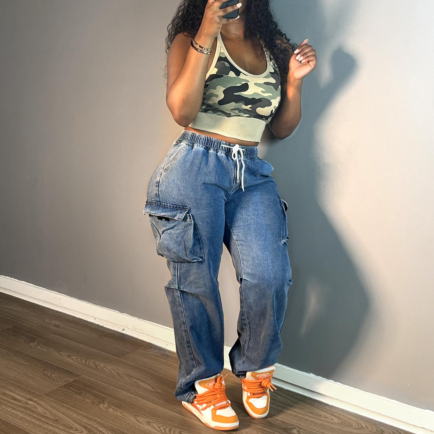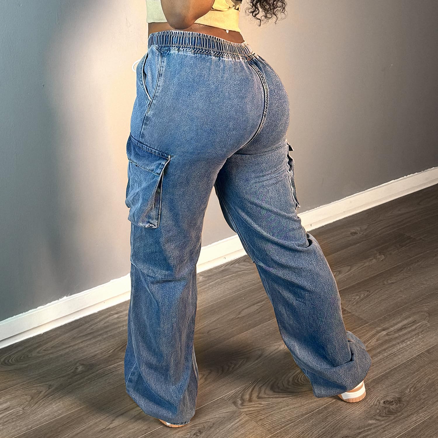 AprPith Mid Rise Cargo Jeans Women Elastic Waist Stretch Wide Leg Denim Pants with Pockets Baggy Streetwear Pants y2k Blue