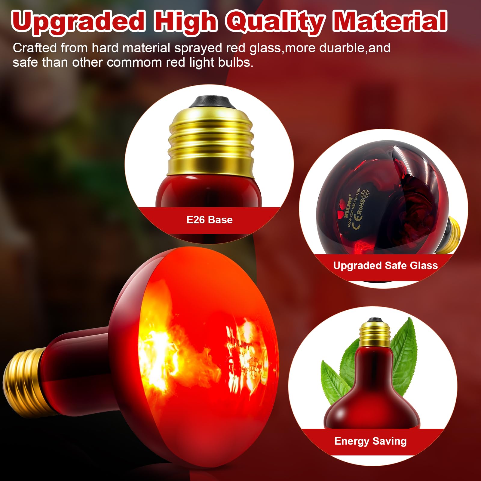 【Upgraded Premium Material】: Crafted from upgraded hard material sprayed red glass, these infrared heat light bulbs are more duarble, stable and safe than other commom red light bulbs, designed to withstand high temperatures, making them ideal for safe operation in humid environments like glass terrariums.