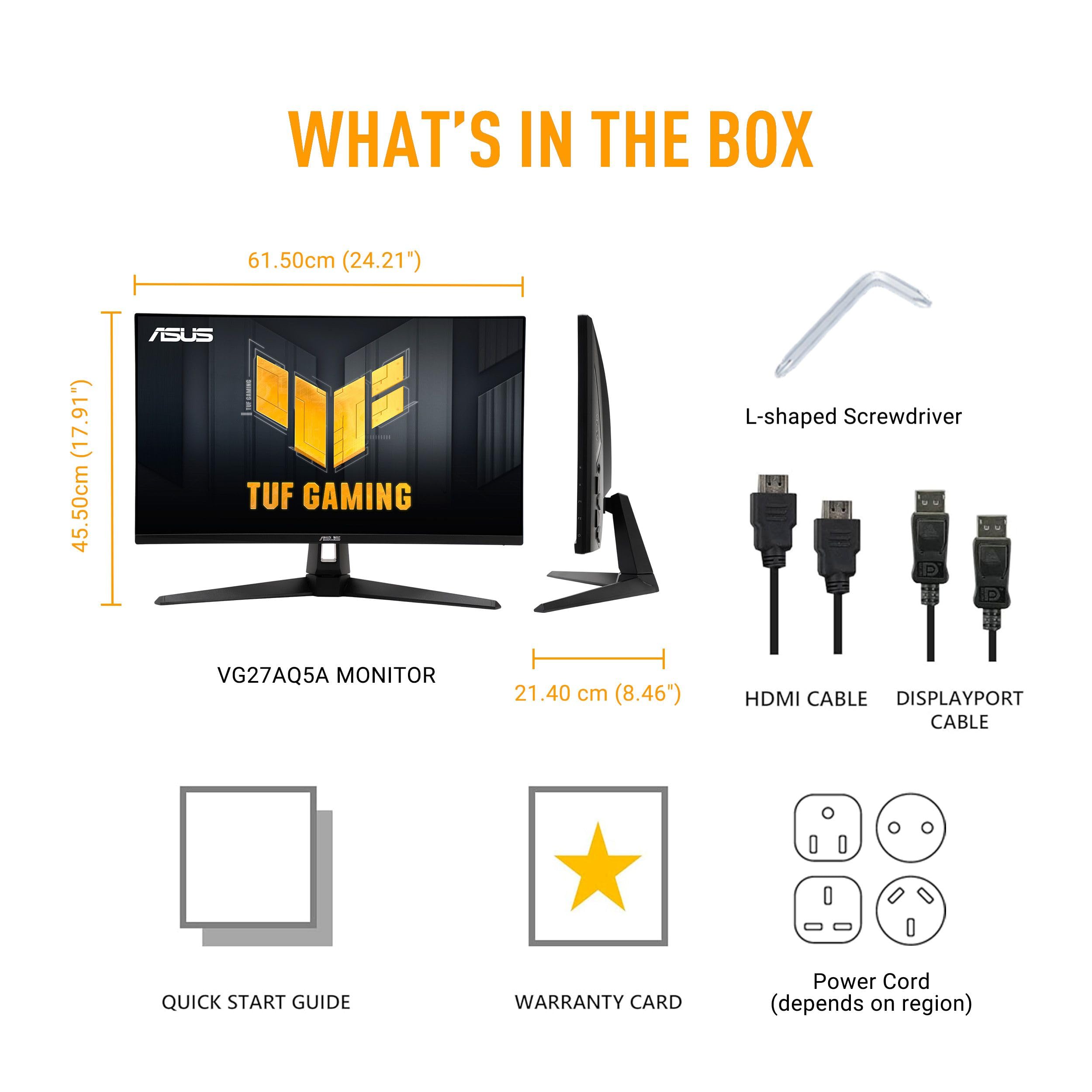 The 27-inch TUF Gaming VG27AQ5A QHD gaming monitor features an IPS panel for blistering fast 210 Hz (OC) gaming. ASUS Extreme Low Motion Blur Sync (ELMB Sync) and AMD FreeSync™ Premium, VESA AdaptiveSync technologies enable buttery-smooth gaming. In addition, it supports HDR and has a 95% DCI-P3 gamut to offer exceptional colors and contrast.