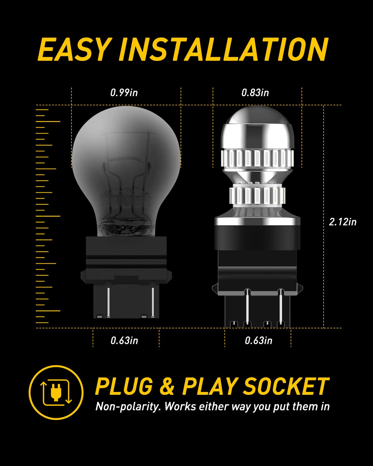 Small size comparable to OEM bulbs. Non-polarity, applied to US standard and CK sockets. Can be used for brake light bulb, side marker light bulb, blinker light bulb, parking lights, etc. Fits: 3056 3156 3157 3157K 3057R 4057 4157, etc.