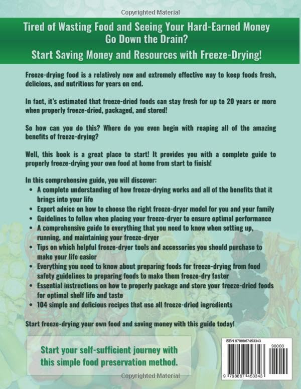 *** GRAB THIS BOOK IN COLOR - B0D11PXZ7Y *** Tired of Wasting Food and Seeing Your Hard-Earned Money Go Down the Drain? Start Saving Money and Resources with Freeze-Drying! Keeping produce, fruit, vegetables and leftovers fresh can be tough, especially when you have many mouths to feed or love purchasing foods wholesale to save money. After all, who doesn’t love a good sale? But keeping all of these foods safe to eat is a hassle, particularly if you have a lot of one particular ingredient lying around. So, what can you do? Is there an easy and safe way to preserve foods for a long time? Luckily, there is! Freeze-drying food is a relatively new and extremely effective way to keep foods fresh, delicious, and nutritious for years on end. In fact, it’s estimated that freeze-dried foods can stay fresh for up to 20 years or more when properly freeze-dried, packaged, and stored! So how can you do this? Where do you even begin with reaping all of the amazing benefits of freeze-drying? Well, this book is a great place to start! It provides you with a complete guide to properly freeze-drying your own food at home from start to finish! In this comprehensive guide, you will discover. 104 Recipes in this Guide/Cookbook you can easily store and enjoy all year round. 21+ Batch Logs to make your life easier, including measurements and conversation. A complete understanding of how freeze-drying works and all of the benefits that it brings into your life. Expert advice on how to choose the right freeze-dryer model for you and your family. Guidelines to follow when placing your freeze-dryer to ensure optimal performance. A comprehensive guide to everything that you need to know when setting up, running, and maintaining your freeze-dryer. Tips on which helpful freeze-dryer tools and accessories you should purchase to make your life easier. Everything you need to know about preparing foods for freeze-drying, from food safety guidelines to preparing foods to make them freeze-dry faster. Essential instructions on how to properly package and store your freeze-dried foods for optimal shelf life and taste. 51 Simple and delicious recipes that use all freeze-dried ingredients. And much more. You don’t have to be experienced with food preservation to get started with freeze-drying your own food at home. In fact, you can be an absolute beginner and start freeze-drying food like a pro within just a few short weeks! This book is simply a must-read for anyone who wants to start preserving their own food with freeze-drying but has no idea where to start. So, what are you waiting for? Start freeze-drying your own food and saving money with this guide today! If you want to start your self-sufficient journey with this simple and delicious food preservation method, scroll up and click the “Add to Cart” 🛒 button right now.