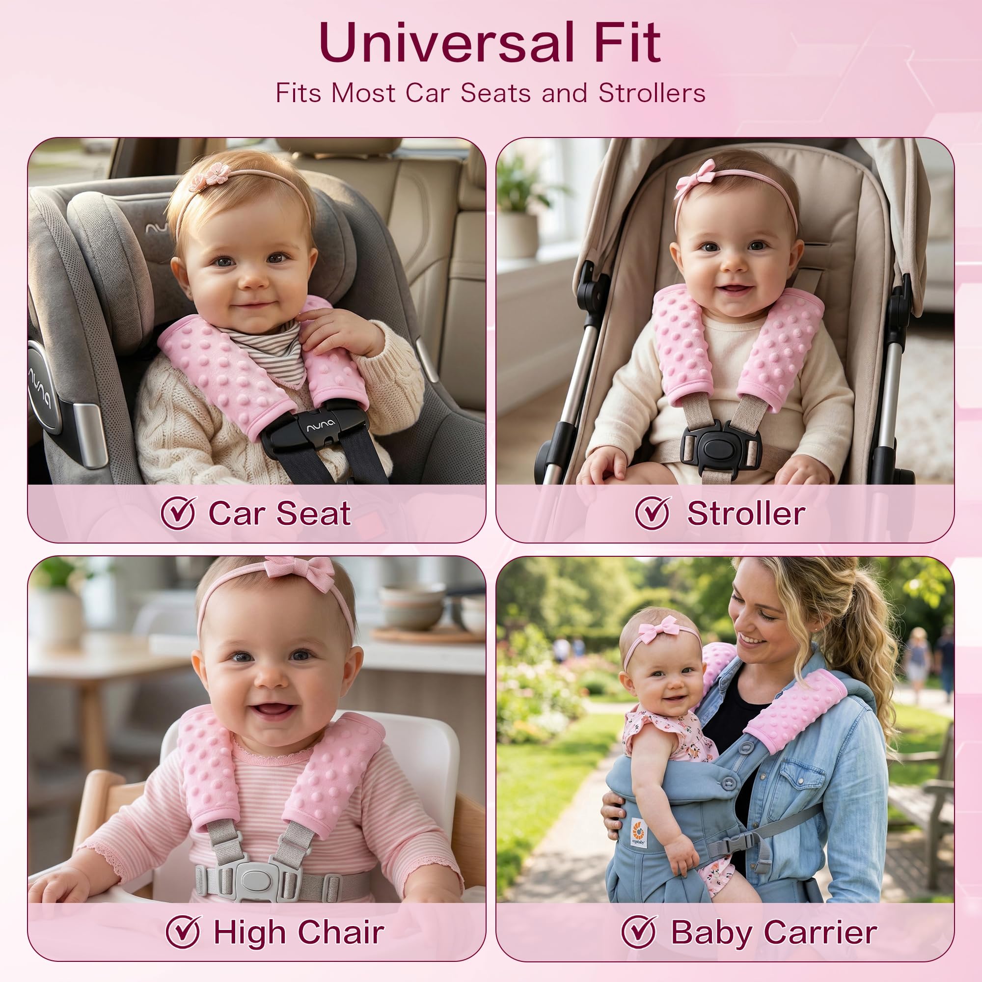 【Multiple Use】: Our car seat strap protectors are perfectly suitful for all the car seats, strollers, pushchairs and infant carriers etc